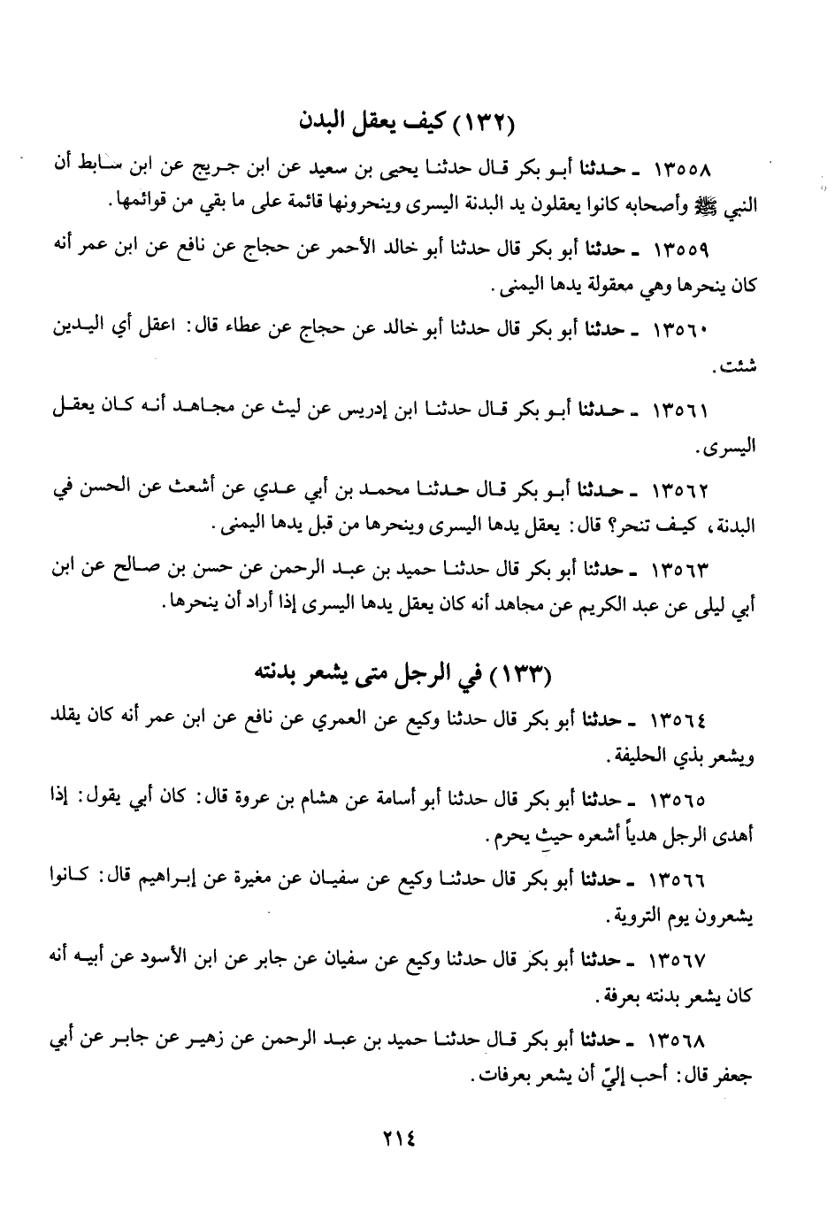 13558 - أَبُو بَكْرٍ قَالَ: حَدَّثَنَا يَحْيَى بْنُ سَعِيدٍ، عَنِ ابْنِ جُرَيْجٍ، عَنِ ابْنِ سَابِطٍ، «أَنَّ النَّبِيَّ صَلَّى اللهُ عَلَيْهِ وَسَلَّمَ وَأَصْحَابَهُ كَانُوا §يَعْقِلُونَ يَدَ الْبَدَنَةِ الْيُسْرَى، وَيَنْحَرُونَهَا قَائِمَةً عَلَى مَا بَقِيَ مِنْ قَوَائِمِهَا»