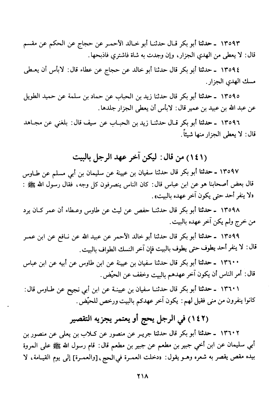 13597 - أَبُو بَكْرٍ قَالَ: حَدَّثَنَا سُفْيَانُ بْنُ عُيَيْنَةَ، عَنْ سُلَيْمَانَ بْنِ أَبِي مُسْلِمٍ، عَنْ طَاوُسٍ، قَالَ بَعْضُ أَصْحَابِنَا: هُوَ عَنِ ابْنِ عَبَّاسٍ قَالَ: كَانَ النَّاسُ يَنْصَرِفُونَ كُلَّ وَجْهٍ، فَقَالَ رَسُولُ اللَّهِ صَلَّى اللهُ عَلَيْهِ وَسَلَّمَ: «§لَا يَنْفِرُ أَحَدٌ، حَتَّى يَكُونَ آخِرَ عَهْدِهِ بِالْبَيْتِ»