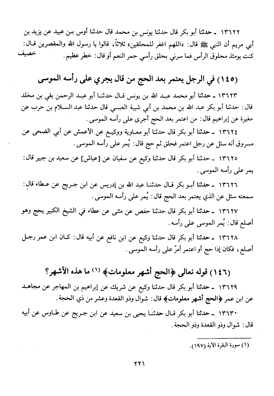 13623 - أَبُو مُحَمَّدٍ عَبْدُ اللَّهِ بْنُ يُونُسَ قَالَ: حَدَّثَنَا أَبُو عَبْدِ الرَّحْمَنِ بَقِيُّ بْنُ مَخْلَدٍ قَالَ: حَدَّثَنَا أَبُو بَكْرٍ عَبْدُ اللَّهِ بْنُ مُحَمَّدِ بْنِ أَبِي شَيْبَةَ الْعَبْسِيُّ قَالَ: حَدَّثَنَا عَبْدُ السَّلَامِ بْنُ حَرْبٍ، عَنْ مُغِيرَةَ، عَنْ إِبْرَاهِيمَ قَالَ: «§مَنِ اعْتَمَرَ بَعْدَ الْحَجِّ أَجْرَى عَلَى رَأْسِهِ الْمُوسَى»