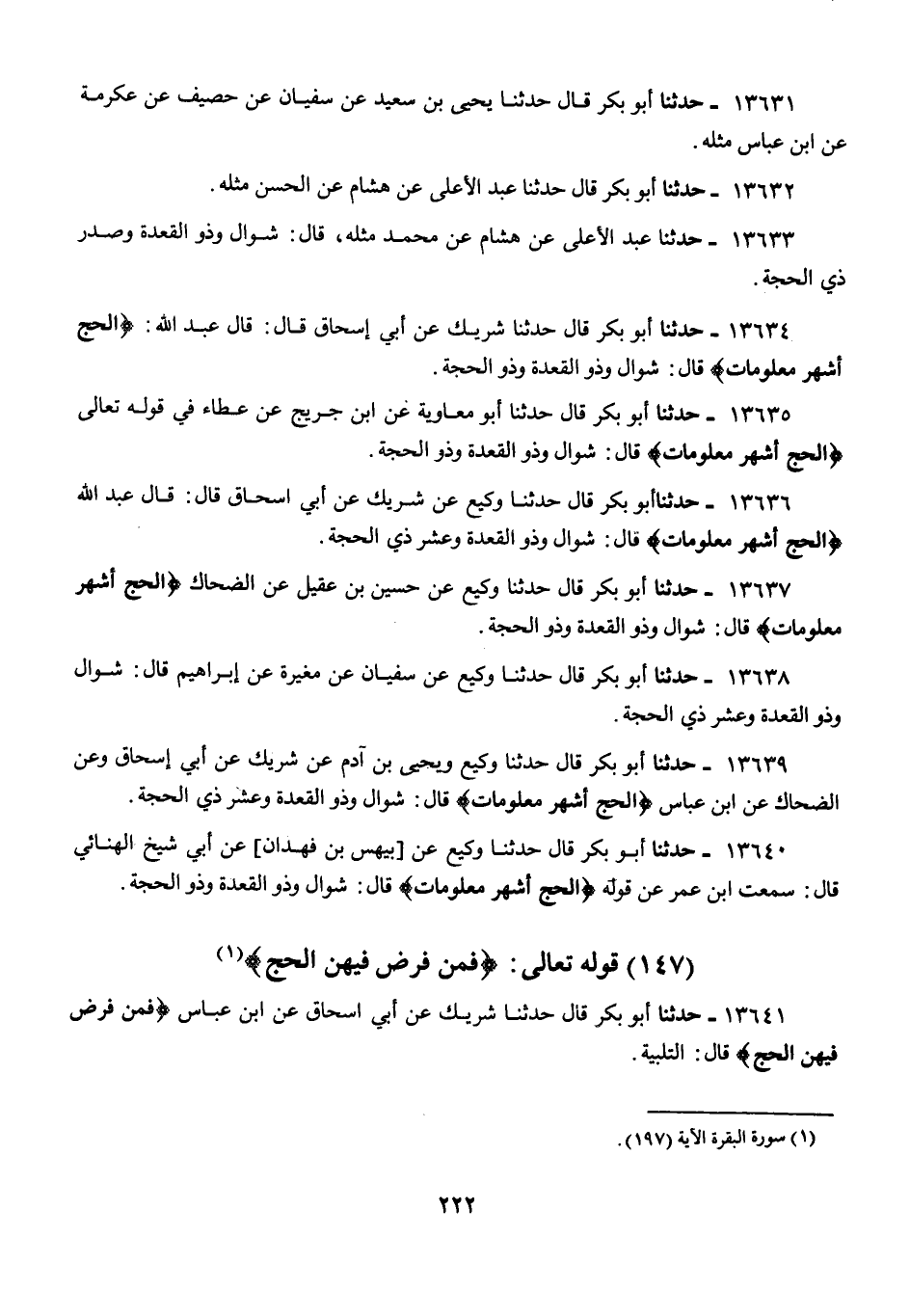 13636 - أَبُو بَكْرٍ قَالَ: حَدَّثَنَا وَكِيعٌ، عَنْ شَرِيكٍ، عَنْ أَبِي إِسْحَاقَ قَالَ: قَالَ عَبْدُ اللَّهِ: {§الْحَجُّ أَشْهُرٌ مَعْلُومَاتٌ} [البقرة: 197] قَالَ: «شَوَّالٌ وَذُو الْقَعْدَةِ وَعَشْرُ ذِي الْحِجَّةِ»