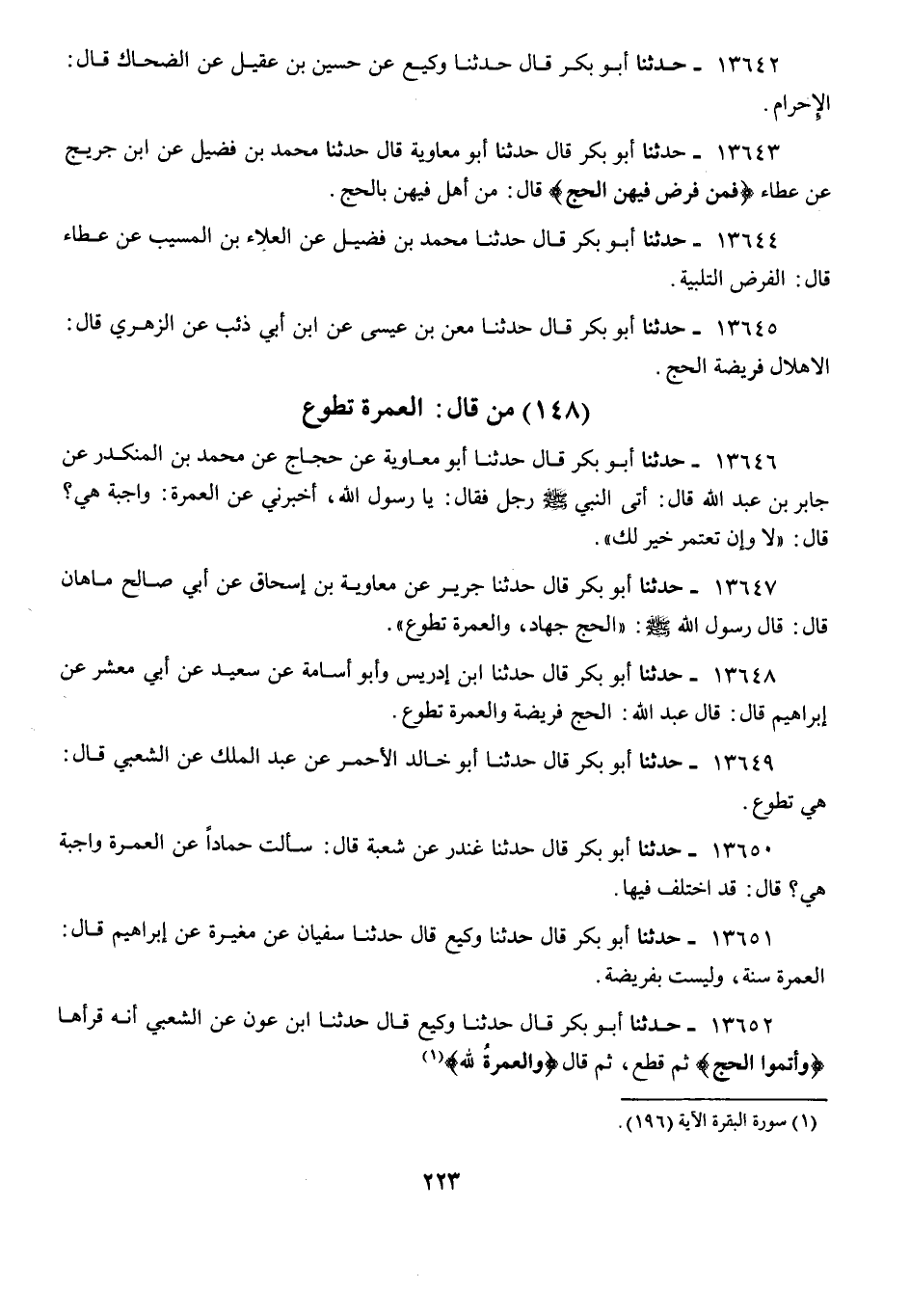 13648 - أَبُو بَكْرٍ قَالَ: حَدَّثَنَا ابْنُ إِدْرِيسَ، وَأَبُو أُسَامَةَ، عَنْ سَعِيدٍ، عَنْ أَبِي مَعْشَرٍ، عَنْ إِبْرَاهِيمَ قَالَ: قَالَ عَبْدُ اللَّهِ: «§الْحَجُّ فَرِيضَةٌ، وَالْعُمْرَةُ تَطَوُّعٌ»