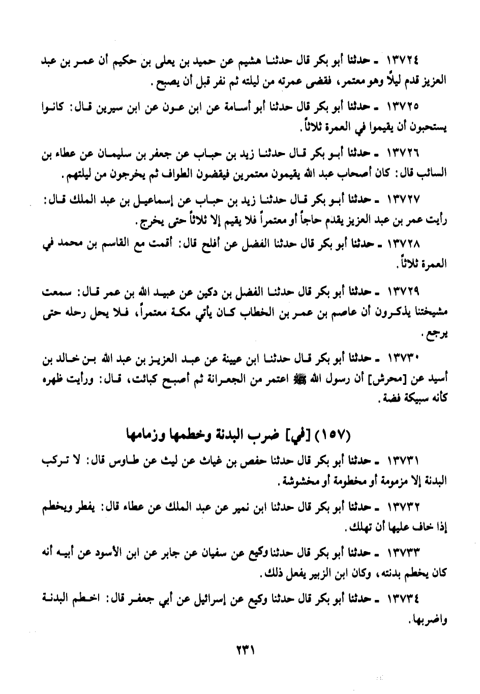13727 - أَبُو بَكْرٍ قَالَ: حَدَّثَنَا زَيْدُ بْنُ حُبَابٍ، عَنْ إِسْمَاعِيلَ بْنِ عَبْدِ الْمَلِكِ قَالَ: رَأَيْتُ عُمَرَ بْنَ عَبْدِ الْعَزِيزِ، «§يَقْدَمُ حَاجًّا أَوْ مُعْتَمِرًا، فَلَا يُقِيمُ إِلَّا ثَلَاثًا حَتَّى يَخْرُجَ»