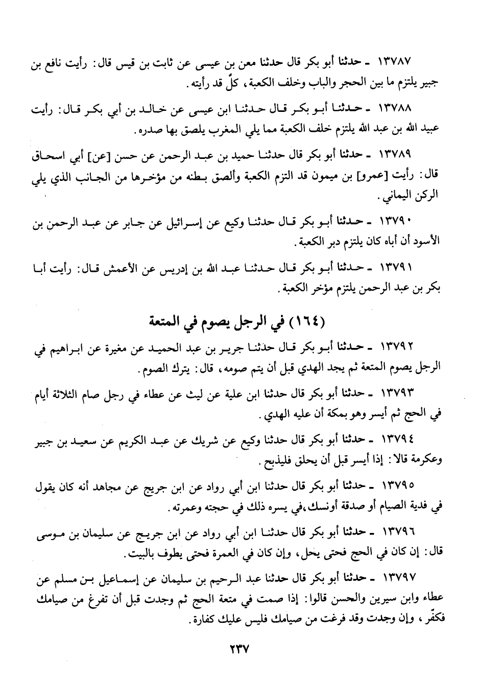 13791 - أَبُو بَكْرٍ قَالَ: حَدَّثَنَا عَبْدُ اللَّهِ بْنِ إِدْرِيسَ، عَنْ إِدْرِيسَ، عَنِ الْأَعْمَشِ قَالَ: رَأَيْتُ أَبَا بَكْرِ بْنَ عَبْدِ الرَّحْمَنِ، «§يَلْتَزِمُ مُؤَخِّرَ الْكَعْبَةِ»
