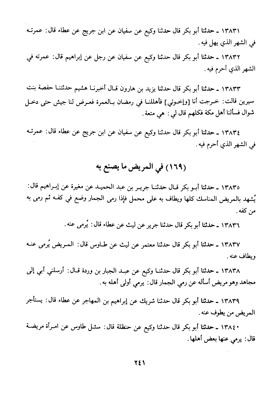 13835 - أَبُو بَكْرٍ قَالَ: حَدَّثَنَا جَرِيرُ، عَنْ عَبْدِ الْحَمِيدِ، عَنْ مُغِيرَةَ، عَنْ إِبْرَاهِيمَ قَالَ: «§يُشْهَدُ بِالْمَرِيضِ الْمَنَاسِكَ كُلَّهَا، وَيُطَافُ بِهِ عَلَى مَحْمَلٍ، فَإِذَا رَمَى الْجِمَارَ وَضَعَ فِي كَفِّهِ، ثُمَّ رَمَى بِهِ مِنْ كَفِّهِ»