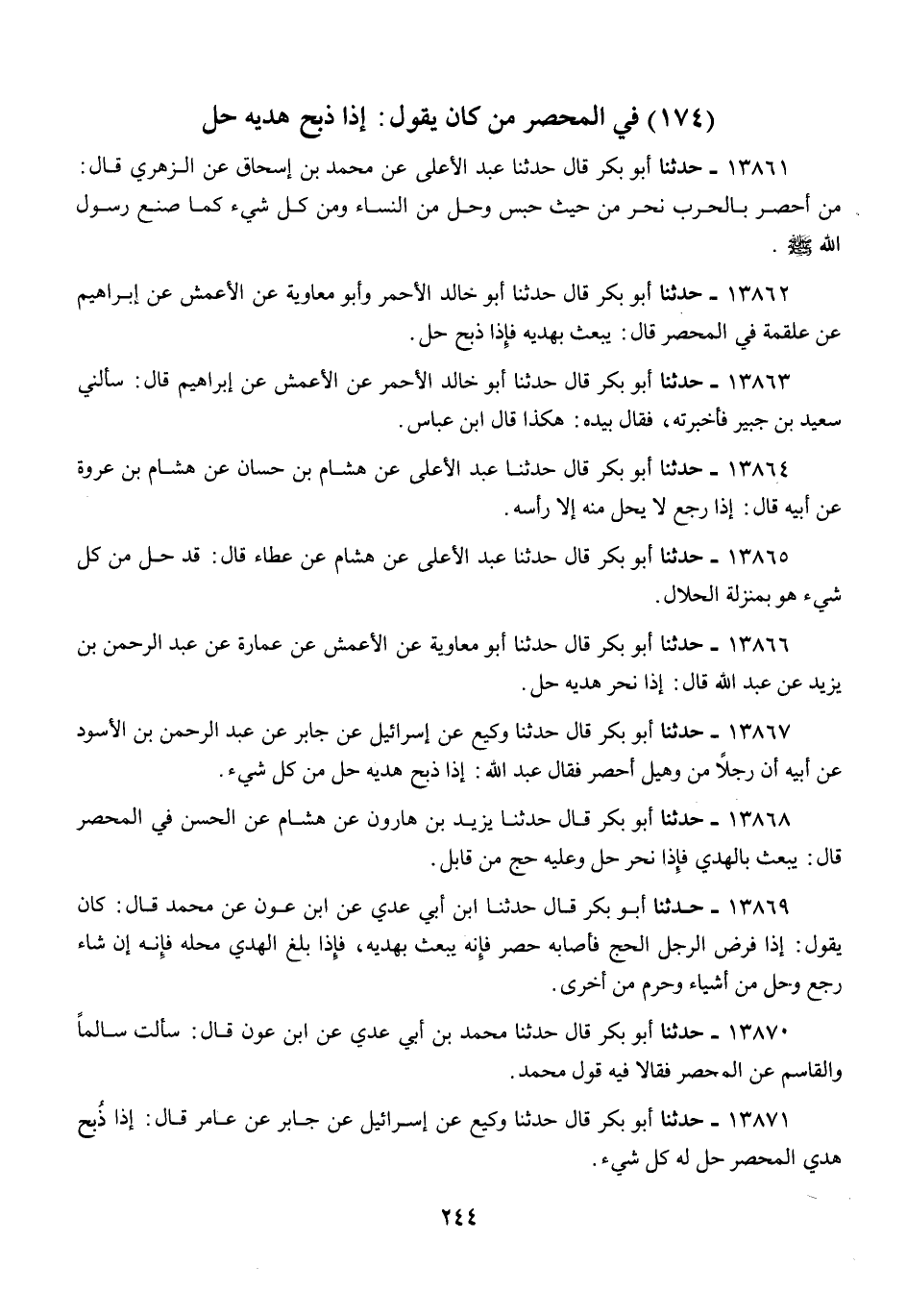 13866 - أَبُو بَكْرٍ قَالَ: حَدَّثَنَا أَبُو مُعَاوِيَةَ، عَنِ الْأَعْمَشِ، عَنْ عُمَارَةَ، عَنْ عَبْدِ الرَّحْمَنِ بْنِ يَزِيدَ، عَنْ عَبْدِ اللَّهِ قَالَ: «§إِذَا نُحِرَ هَدْيُهُ حَلَّ»