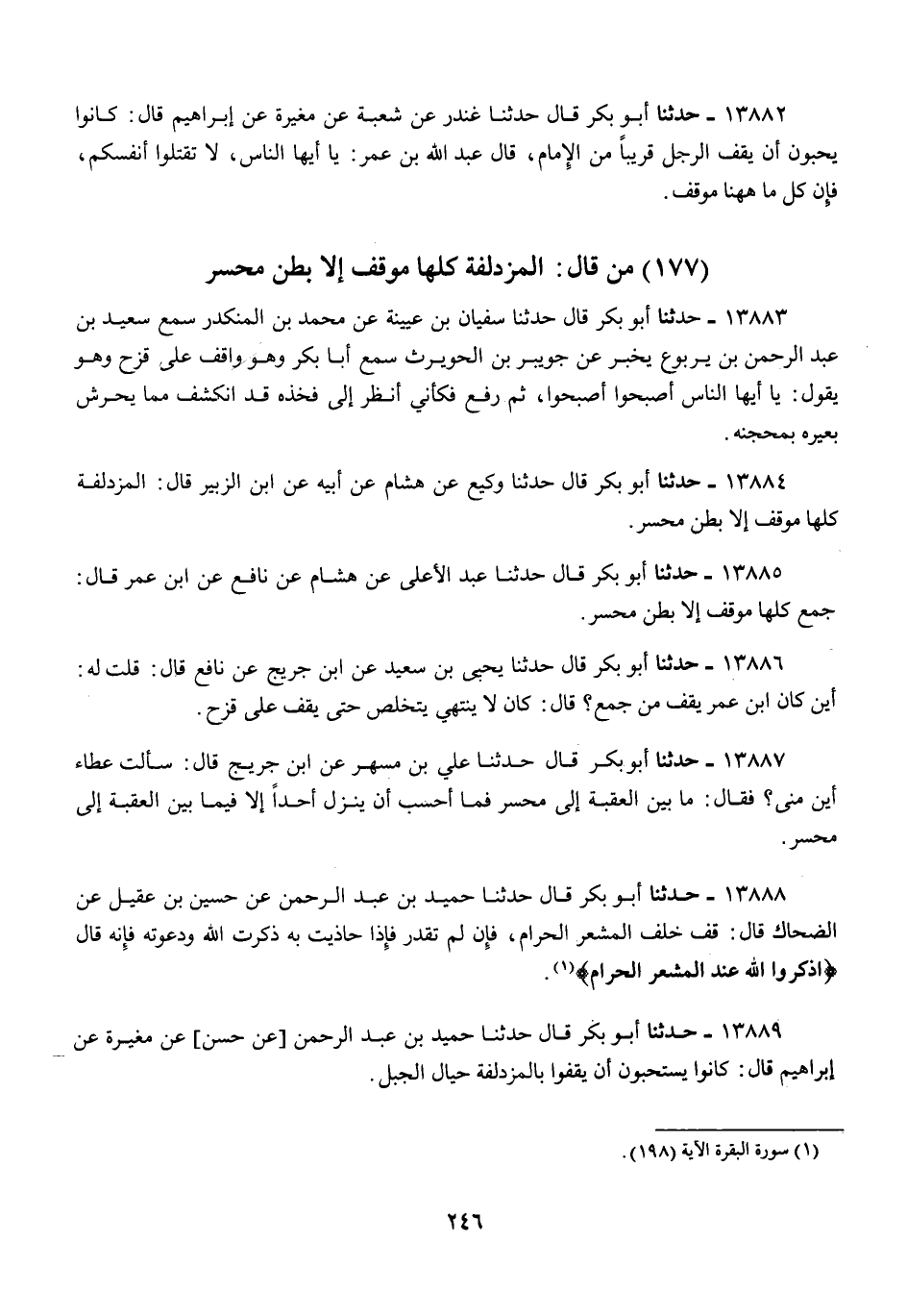 13884 - أَبُو بَكْرٍ قَالَ: حَدَّثَنَا وَكِيعٌ، عَنْ هِشَامٍ، عَنْ أَبِيهِ، عَنِ ابْنِ الزُّبَيْرِ قَالَ: «§الْمُزْدَلِفَةُ كُلُّهَا مَوْقِفٌ إِلَّا بَطْنَ مُحَسِّرٍ»