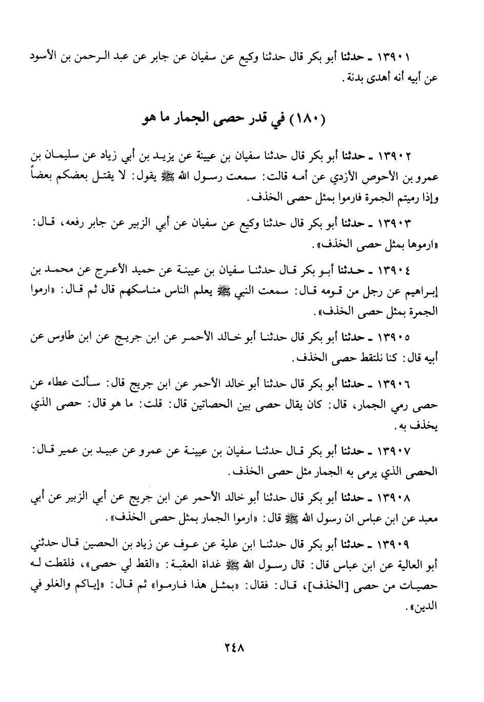 13904 - أَبُو بَكْرٍ قَالَ: حَدَّثَنَا سُفْيَانُ بْنُ عُيَيْنَةَ، عَنْ حُمَيْدٍ الْأَعْرَجِ، عَنْ مُحَمَّدِ بْنِ إِبْرَاهِيمَ، عَنْ رَجُلٍ، مِنْ قَوْمِهِ قَالَ: سَمِعْتُ النَّبِيَّ صَلَّى اللهُ عَلَيْهِ وَسَلَّمَ يُعَلِّمُ النَّاسَ مَنَاسِكَهُمْ، قَالَ ثُمَّ قَالَ: «§ارْمُوا الْجَمْرَةَ بِمِثْلِ حَصَى الْخَذْفِ»