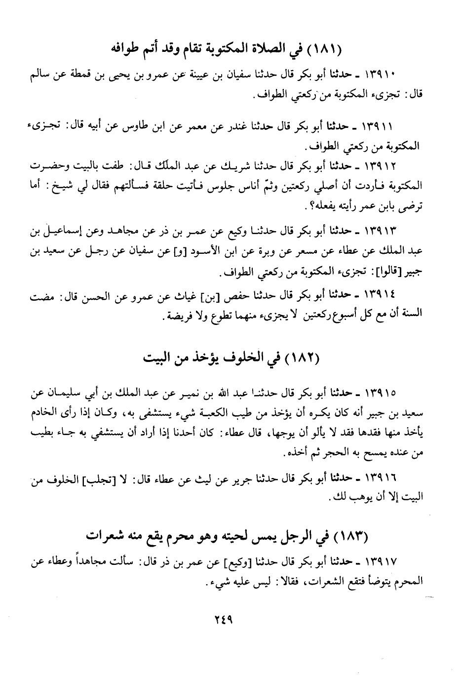 13917 - أَبُو بَكْرٍ قَالَ: حَدَّثَنَا وَكِيعٌ، عَنْ عُمَرَ بْنِ ذَرٍّ، قَالَ: سَأَلْتُ مُجَاهِدًا، وَعَطَاءً، عَنِ الْمُحْرِمِ، يَتَوَضَّأُ فَتَقَعُ الشَّعَرَاتُ فَقَالَا: «§لَيْسَ عَلَيْهِ شَيْءٌ»