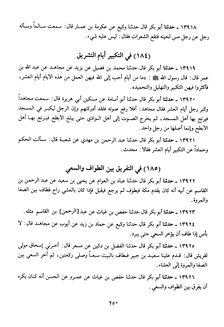 13921 - أَبُو بَكْرٍ قَالَ: حَدَّثَنَا عَبْدُ الرَّحْمَنِ بْنُ مَهْدِيٍّ، عَنْ شُعْبَةَ، قَالَ: سَأَلْتُ الْحَكَمَ، وَحَمَّادًا، عَنْ §التَّكْبِيرِ أَيَّامَ الْعَشْرِ فَقَالَا: «مُحْدَثٌ»