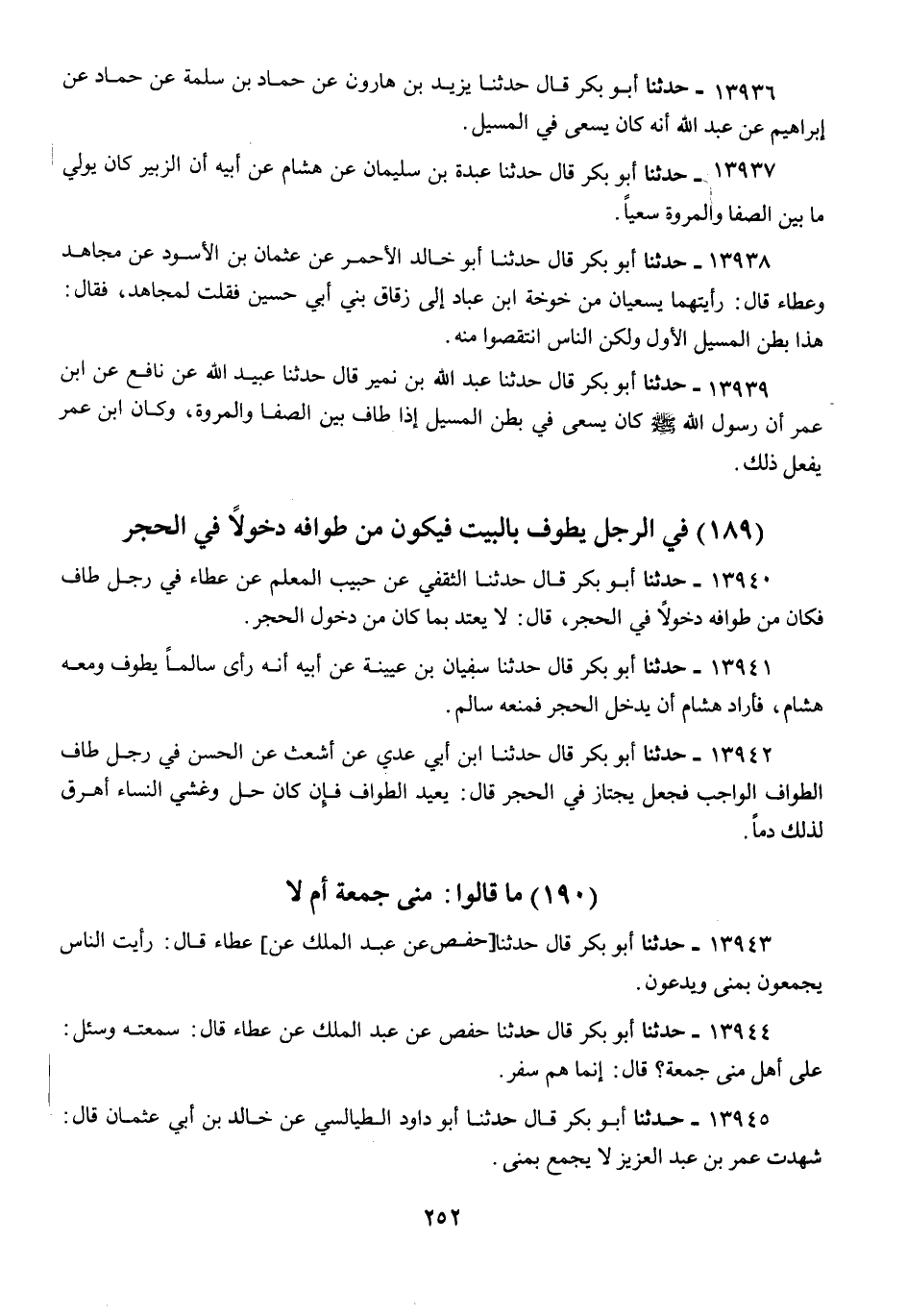 13937 - أَبُو بَكْرٍ قَالَ: حَدَّثَنَا عَبْدَةُ بْنُ سُلَيْمَانَ، عَنَ هِشَامَ، عَنْ أَبِيهِ، أَنَّ الزُّبَيْرَ كَانَ §يُولِي مَا بَيْنَ الصَّفَا وَالْمَرْوَةَ سَعْيَا "
