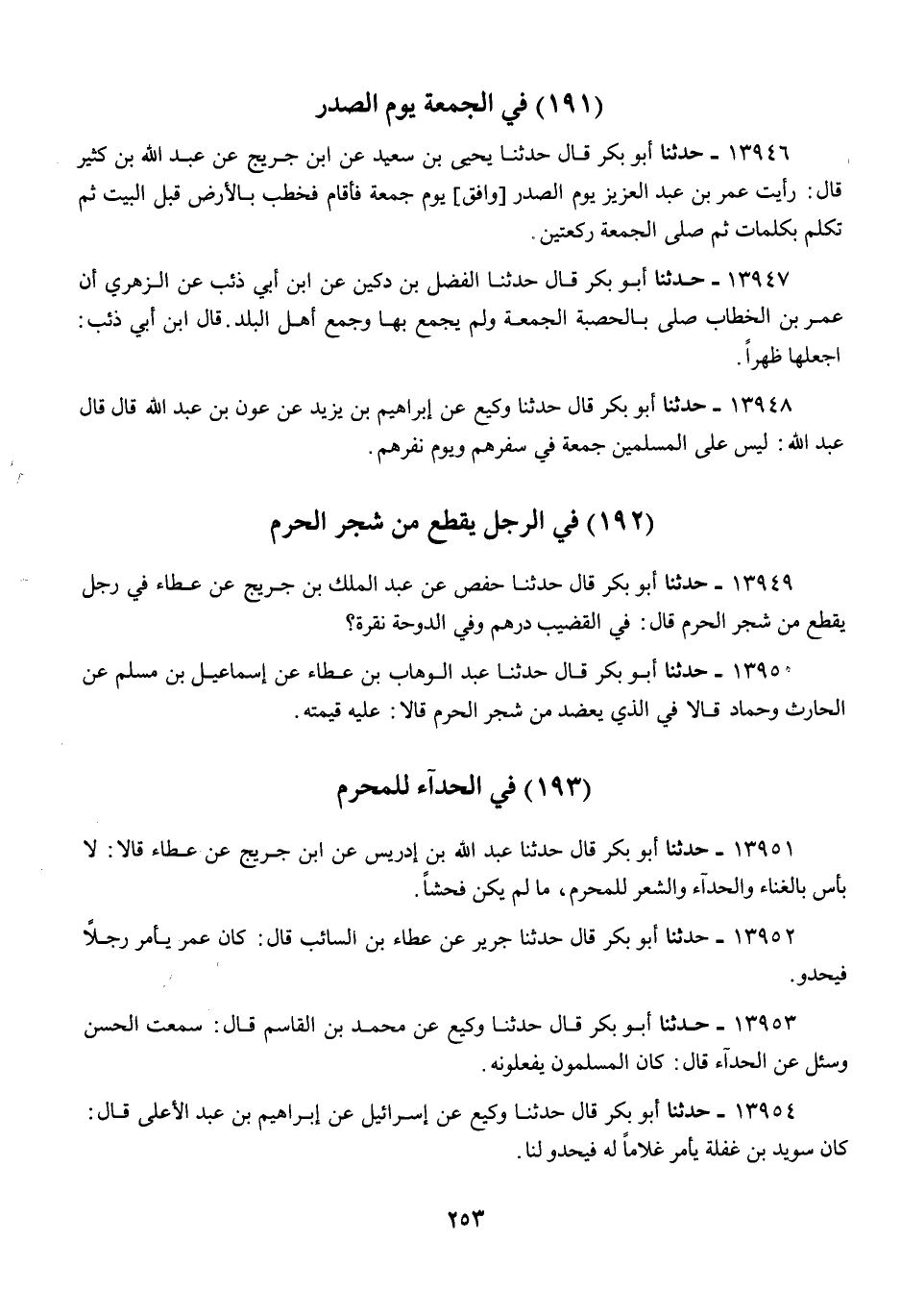 13946 - أَبُو بَكْرٍ قَالَ: حَدَّثَنَا يَحْيَى بْنُ سَعِيدٍ، عَنِ ابْنِ جُرَيْجٍ، عَنْ عَبْدِ اللَّهِ بْنِ كَثِيرٍ قَالَ: «رَأَيْتُ عُمَرَ بْنَ عَبْدِ الْعَزِيزِ يَوْمَ الصَّدَرِ §وَافَقَ يَوْمَ جُمُعَةٍ، فَأَقَامَ فَخَطَبَ بِالْأَرْضِ قِبَلَ الْبَيْتِ، ثُمَّ تَكَلَّمَ بِكَلِمَاتٍ، ثُمَّ صَلَّى الْجُمُعَةَ رَكْعَتَيْنِ»