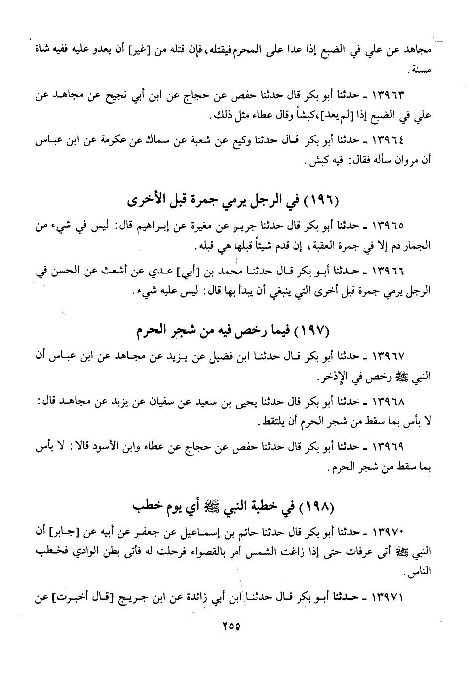 13971 - أَبُو بَكْرٍ قَالَ: حَدَّثَنَا ابْنُ أَبِي زَائِدَةَ، عَنِ ابْنِ جُرَيْجٍ قَالَ: أُخْبِرْتُ عَنْ مُحَمَّدِ بْنِ قَيْسِ بْنِ الْمُطَّلِبِ، «أَنَّ النَّبِيَّ صَلَّى اللهُ عَلَيْهِ وَسَلَّمَ §خَطَبَ بِعَرَفَةَ»