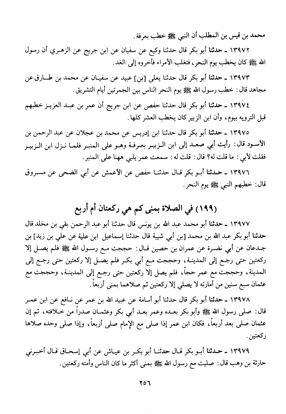 13980 - أَبُو بَكْرٍ قَالَ: حَدَّثَنَا شَبَابَةُ بْنُ سَوَّارٍ، عَنْ لَيْثِ بْنِ سَعْدٍ، عَنْ بُكَيْرِ بْنِ الْأَشَجِّ، عَنْ مُحَمَّدِ بْنِ عَبْدِ الرَّحْمَنِ بْنِ أَسْلَمَ، عَنْ أَنَسٍ قَالَ: «§صَلَّيْتُ مَعَ النَّبِيِّ صَلَّى اللهُ عَلَيْهِ وَسَلَّمَ بِمِنًى رَكْعَتَيْنِ، وَمَعَ أَبِي بَكْرٍ، وَمَعَ عُمَرَ، وَمَعَ عُثْمَانَ صَدْرًا مِنْ إِمَارَتِهِ»