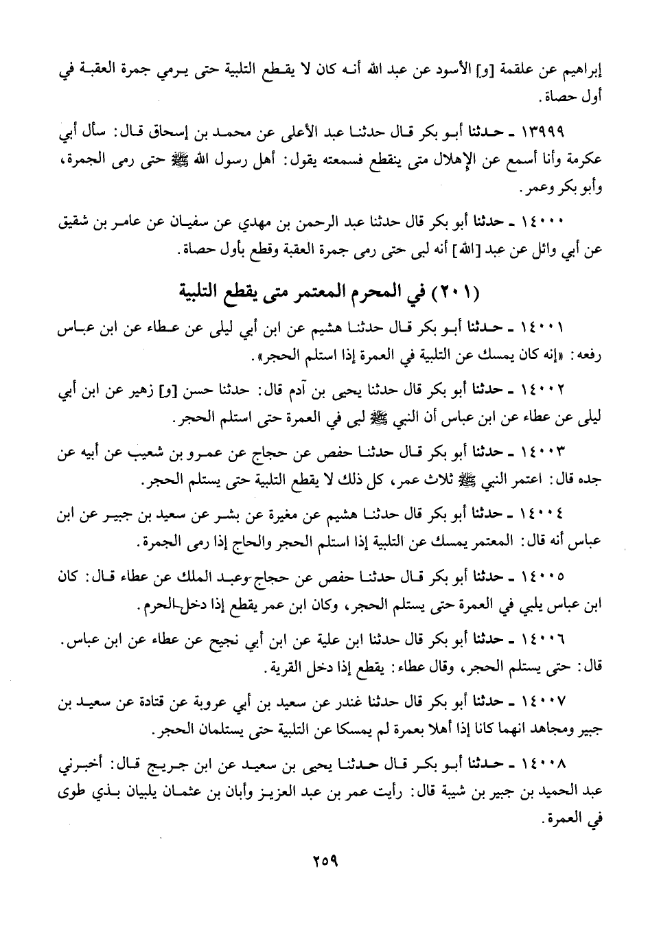 14002 - أَبُو بَكْرٍ قَالَ: حَدَّثَنَا يَحْيَى بْنُ آدَمَ قَالَ: حَدَّثَنَا حَسَنٌ وَزُهَيْرٌ، عَنِ ابْنِ أَبِي لَيْلَى، عَنْ عَطَاءٍ، عَنِ ابْنِ عَبَّاسٍ، «أَنَّ النَّبِيَّ صَلَّى اللهُ عَلَيْهِ وَسَلَّمَ §لَبَّى فِي الْعُمْرَةِ حَتَّى اسْتَلَمَ الْحَجَرَ»