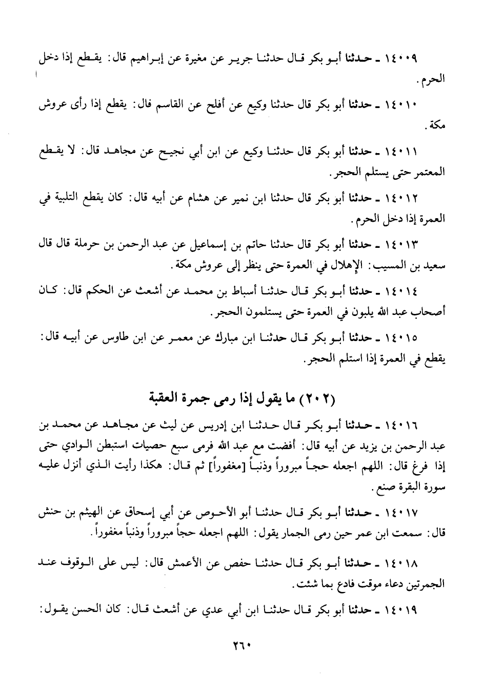 14012 - أَبُو بَكْرٍ قَالَ: حَدَّثَنَا ابْنُ نُمَيْرٍ، عَنْ هِشَامٍ، عَنْ أَبِيهِ قَالَ: «كَانَ §يَقْطَعُ التَّلْبِيَةَ فِي الْعُمْرَةِ إِذَا دَخَلَ الْحَرَمَ»