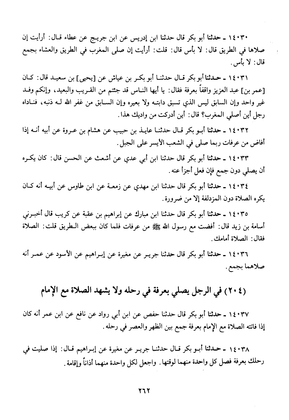 14035 - أَبُو بَكْرٍ قَالَ: حَدَّثَنَا ابْنُ مُبَارَكٍ، عَنْ إِبْرَاهِيمَ بْنِ عُقْبَةَ، عَنْ كُرَيْبٍ قَالَ: أَخْبَرَنِي أُسَامَةُ بْنُ زَيْدٍ قَالَ: أَفَضْتُ مَعَ رَسُولِ اللَّهِ صَلَّى اللهُ عَلَيْهِ وَسَلَّمَ مِنْ عَرَفَاتٍ، فَلَمَّا كَانَ بِبَعْضِ الطَّرِيقِ قُلْتُ: الصَّلَاةُ، فَقَالَ: «§الصَّلَاةُ أَمَامَكَ»