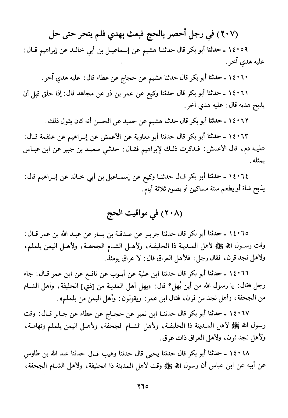 14067 - أَبُو بَكْرٍ قَالَ: حَدَّثَنَا ابْنُ نُمَيْرٍ، عَنْ حَجَّاجٍ، عَنْ عَطَاءٍ، عَنْ جَابِرٍ قَالَ: «§وَقَّتَ رَسُولُ اللَّهِ صَلَّى اللهُ عَلَيْهِ وَسَلَّمَ لِأَهْلِ الْمَدِينَةِ ذَا الْحُلَيْفَةِ، وَلِأَهْلِ الشَّامِ الْجُحْفَةَ، وَلِأَهْلِ الْيَمَنِ يَلَمْلَمَ وَتِهَامَةَ، وَلِأَهْلِ نَجْدٍ قَرْنًا، وَلِأَهْلِ الْعِرَاقِ ذَاتَ عِرْقٍ»