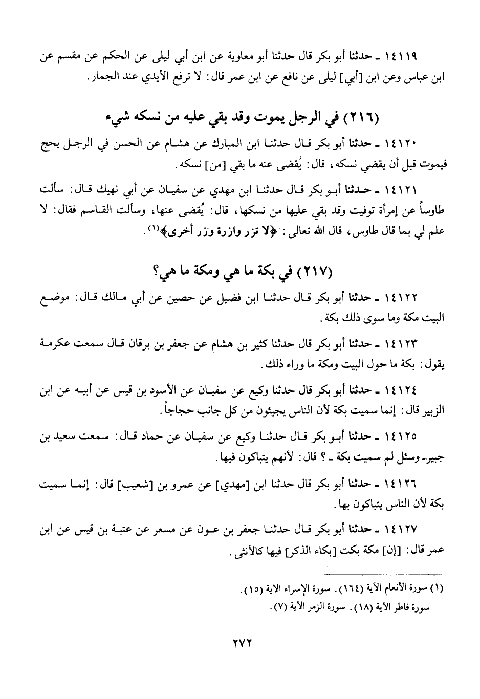 14125 - أَبُو بَكْرٍ قَالَ: حَدَّثَنَا وَكِيعٌ، عَنْ سُفْيَانَ، عَنْ حَمَّادٍ قَالَ: سَمِعْتُ سَعِيدَ بْنَ جُبَيْرٍ، وَسُئِلَ، لِمَ §سُمِّيَتْ بَكَّةَ،؟ قَالَ: «لِأَنَّهُمْ يَتَبَاكَوْنَ فِيهَا»