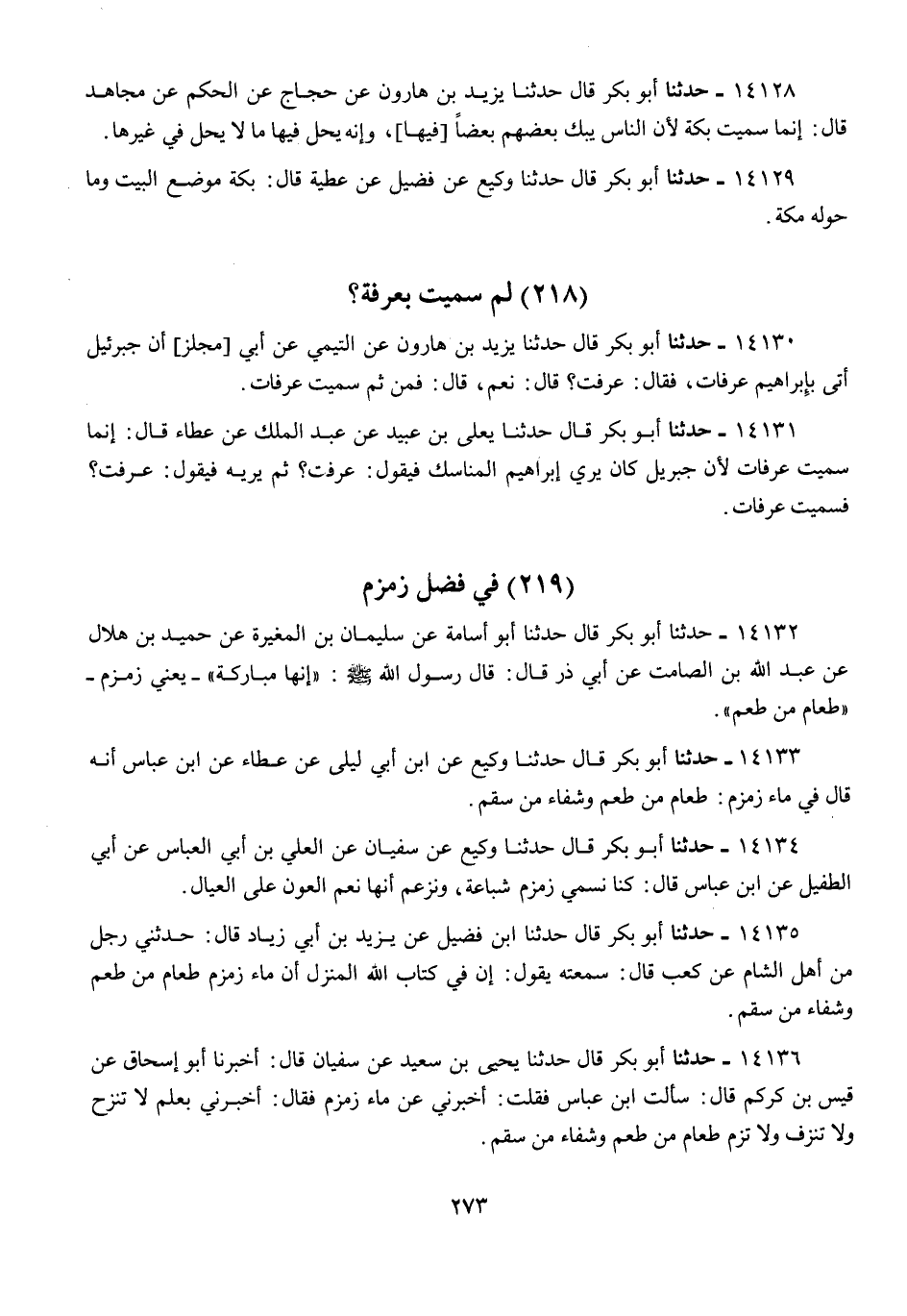 14130 - أَبُو بَكْرٍ قَالَ: حَدَّثَنَا يَزِيدُ بْنُ هَارُونَ، عَنِ التَّيْمِيِّ، عَنْ أَبِي مِجْلَزٍ، " أَنَّ §جَبْرَائِيلَ أَتَى بِإِبْرَاهِيمَ عَرَفَاتٍ، فَقَالَ: عَرَفْتَ؟ قَالَ: نَعَمْ، قَالَ: فَمِنْ ثَمَّ سُمِّيَتْ عَرَفَاتٍ "