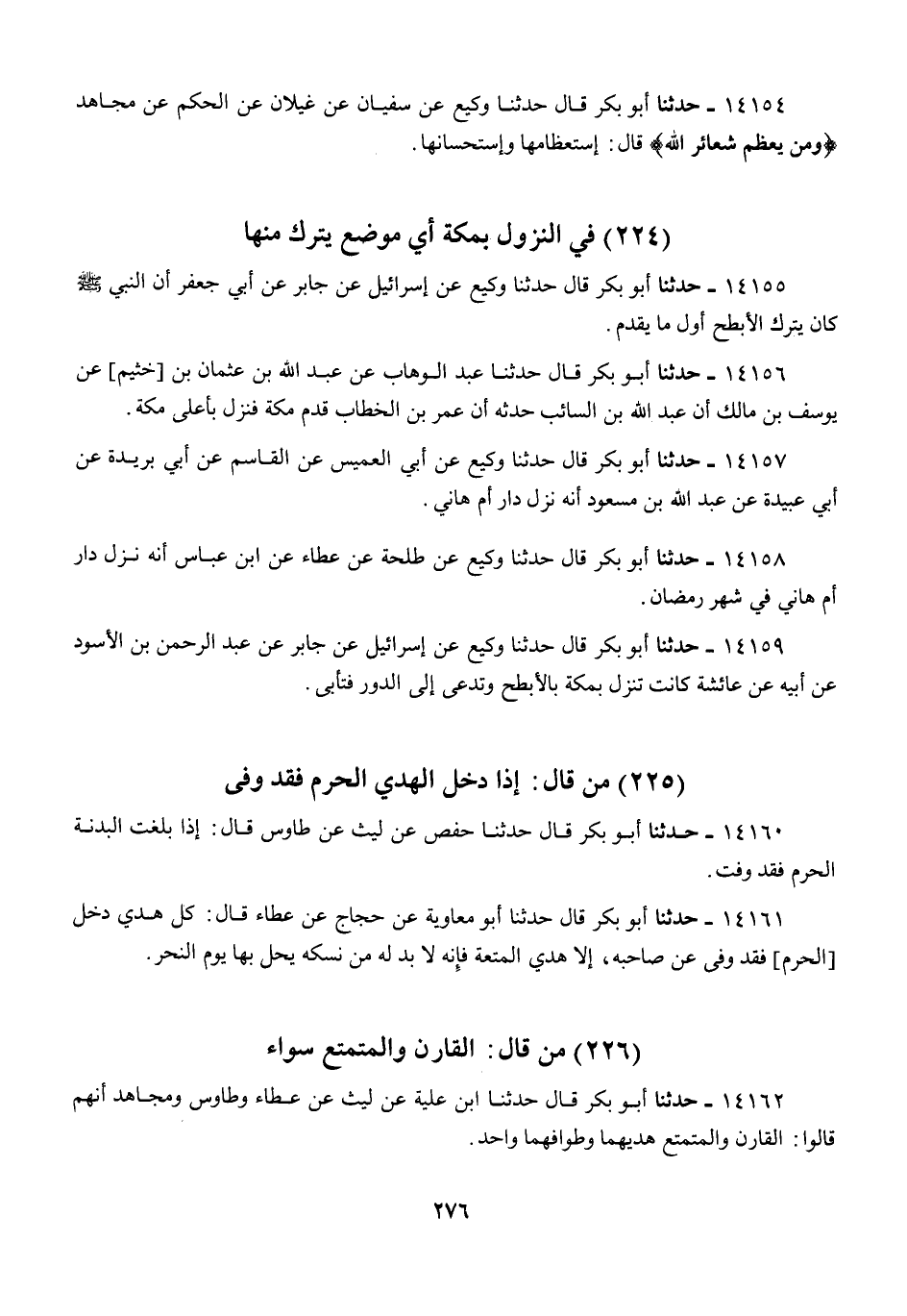14155 - أَبُو بَكْرٍ قَالَ: حَدَّثَنَا وَكِيعٌ، عَنْ إِسْرَائِيلَ، عَنْ جَابِرٍ، عَنْ أَبِي جَعْفَرٍ، «أَنَّ النَّبِيَّ صَلَّى اللهُ عَلَيْهِ وَسَلَّمَ، كَانَ §يَتْرُكُ الْأَبْطَحَ أَوَّلَ مَا يَقْدَمُ»