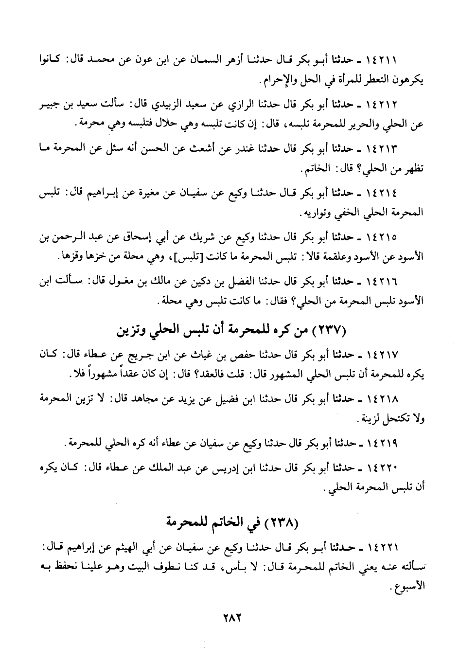 14220 - أَبُو بَكْرٍ قَالَ: حَدَّثَنَا ابْنُ إِدْرِيسَ، عَنْ عَبْدِ الْمَلِكِ، عَنْ عَطَاءٍ قَالَ: «كَانَ §يُكْرَهُ أَنْ تَلْبَسَ الْمُحْرِمَةُ الْحُلِيَّ»