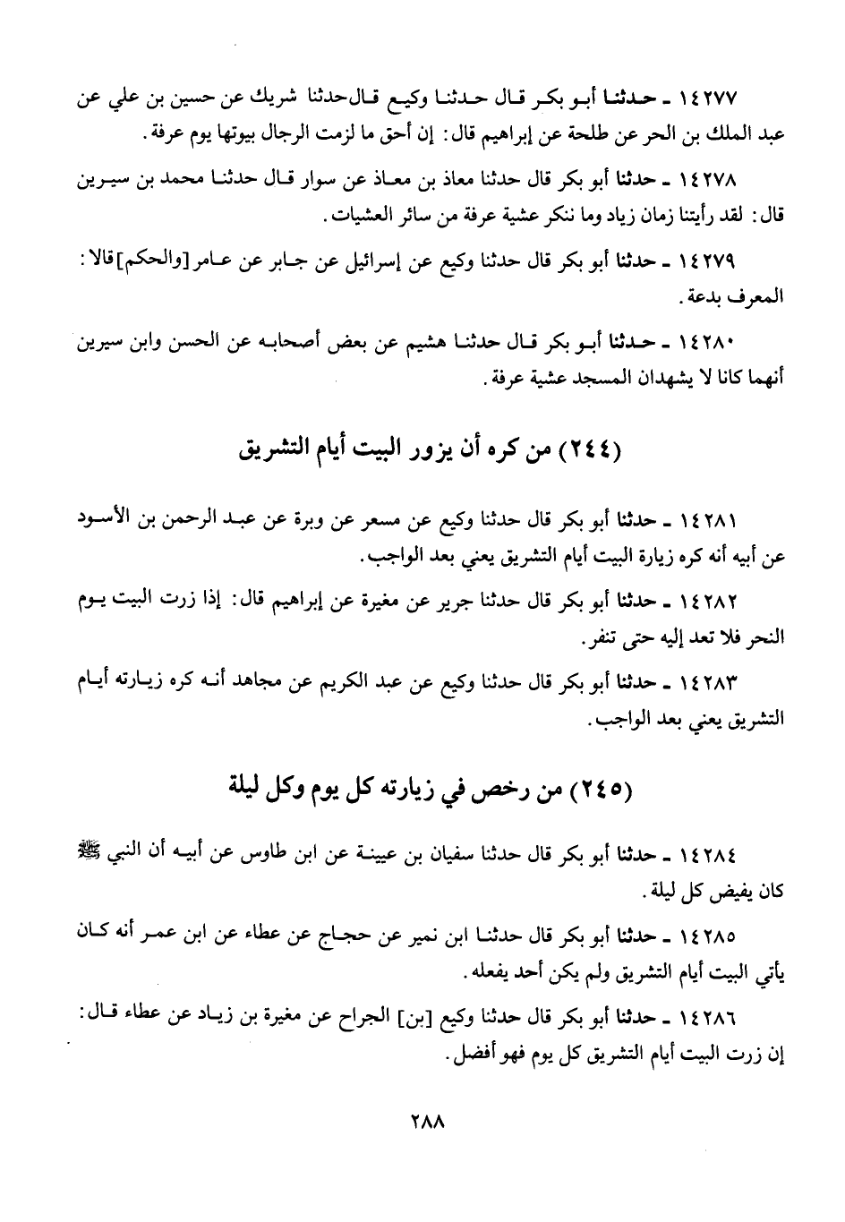 14281 - أَبُو بَكْرٍ قَالَ: حَدَّثَنَا وَكِيعٌ، عَنْ مِسْعَرٍ، عَنْ وَبَرَةَ، عَنْ عَبْدِ الرَّحْمَنِ بْنِ الْأَسْوَدِ، عَنْ أَبِيهِ، «أَنَّهُ §كَرِهَ زِيَارَةَ الْبَيْتِ أَيَّامَ التَّشْرِيقِ» يَعْنِي بَعْدَ الْوَاجِبِ