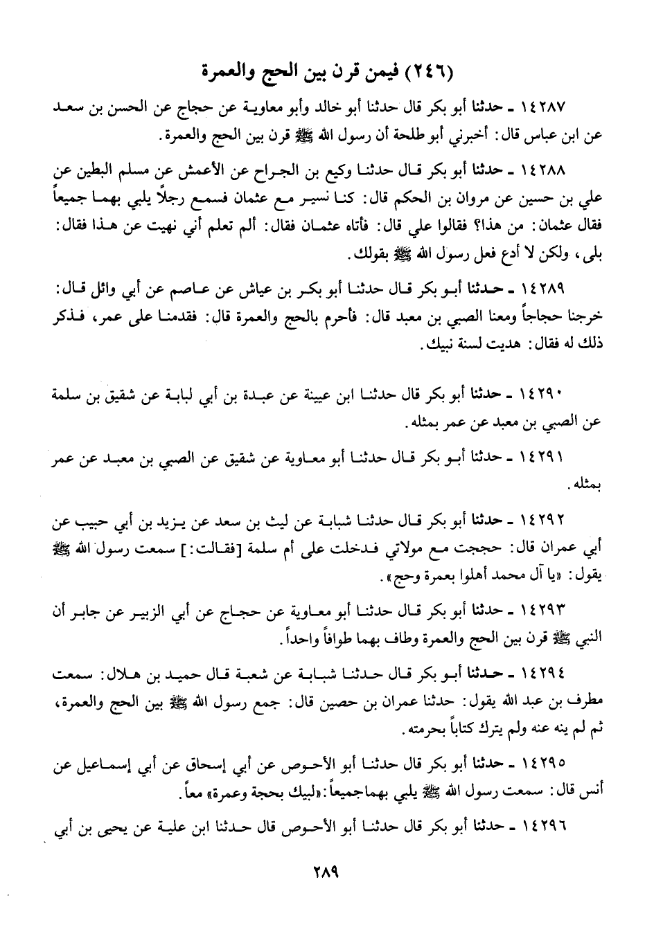 14294 - أَبُو بَكْرٍ قَالَ: حَدَّثَنَا شَبَابَةُ، عَنْ شُعْبَةَ، قَالَ حُمَيْدُ بْنُ هِلَالٍ: سَمِعْتُ مُطَرِّفَ بْنَ عَبْدِ اللَّهِ يَقُولُ: حَدَّثَنَا عِمْرَانُ بْنُ حُصَيْنٍ قَالَ: «§جَمَعَ رَسُولُ اللَّهِ صَلَّى اللهُ عَلَيْهِ وَسَلَّمَ بَيْنَ الْحَجِّ وَالْعُمْرَةِ، ثُمَّ لَمْ يَنْهَ عَنْهُ، وَلَمْ يَتْرُكْ كِتَابًا بِحُرْمَتِهِ»