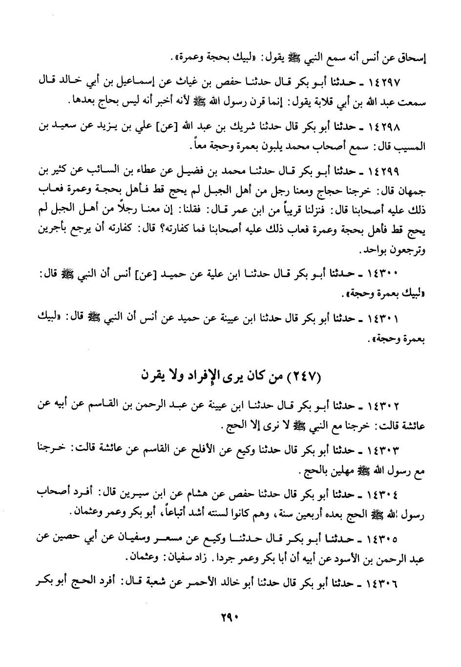14306 - أَبُو بَكْرٍ قَالَ: حَدَّثَنَا أَبُو خَالِدٍ الْأَحْمَرُ، عَنْ شُعْبَةَ قَالَ: «§أَفْرَدَ الْحَجَّ أَبُو بَكْرٍ، وَعُمَرُ، وَعُثْمَانُ، وَعَلْقَمَةُ، وَالْأَسْوَدُ»