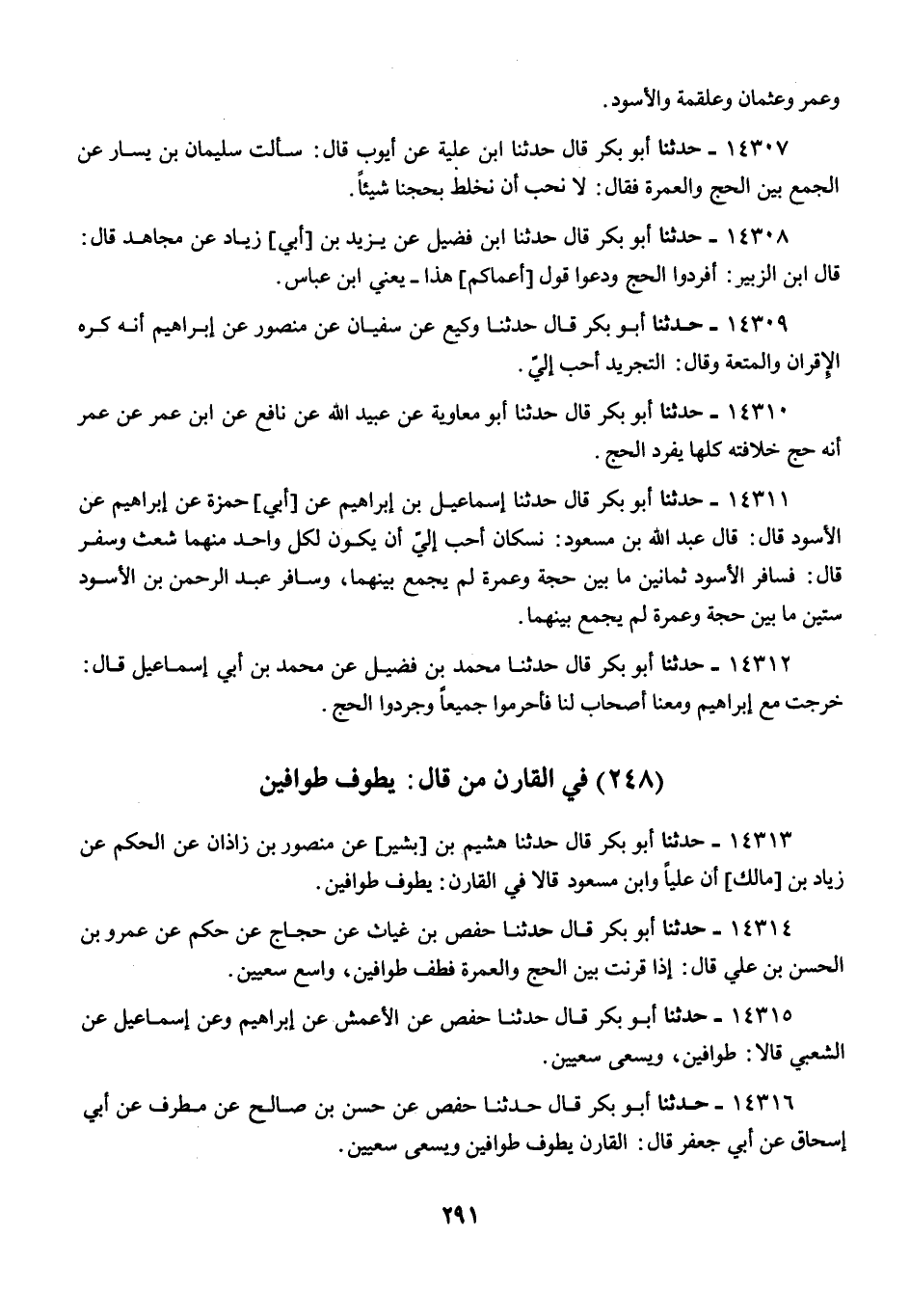 14316 - أَبُو بَكْرٍ قَالَ: حَدَّثَنَا حَفْصٌ، عَنْ حَسَنِ بْنِ صَالِحٍ، عَنْ مُطَرِّفٍ، عَنْ أَبِي إِسْحَاقَ، عَنْ أَبِي جَعْفَرٍ قَالَ: «§الْقَارِنُ يَطُوفُ طَوَافَيْنِ، وَيَسْعَى سَعْيَيْنِ»
