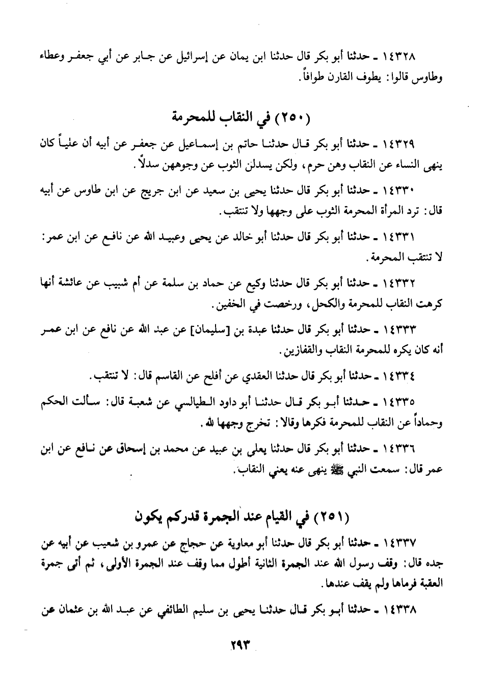 14335 - أَبُو بَكْرٍ قَالَ: حَدَّثَنَا أَبُو دَاوُدَ الطَّيَالِسِيُّ، عَنْ شُعْبَةَ قَالَ: سَأَلْتُ الْحَكَمَ، وَحَمَّادًا، عَنِ النِّقَابِ لِلْمُحْرِمَةِ فَكَرِهَا وَقَالَا: «§تُخْرِجُ وَجْهَهَا لِلَّهِ»
