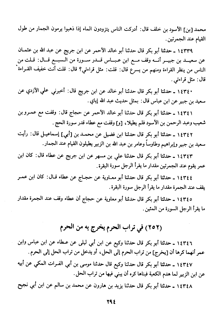 14345 - أَبُو بَكْرٍ قَالَ: حَدَّثَنَا أَبُو مُعَاوِيَةَ، عَنْ حَجَّاجٍ، أَنَّ عَطَاءً «§وَقَفَ عِنْدَ الْجَمْرَةِ مِقْدَارَ مَا يَقْرَأُ الرَّجُلُ السُّورَةَ مِنَ الْمِئِينَ»