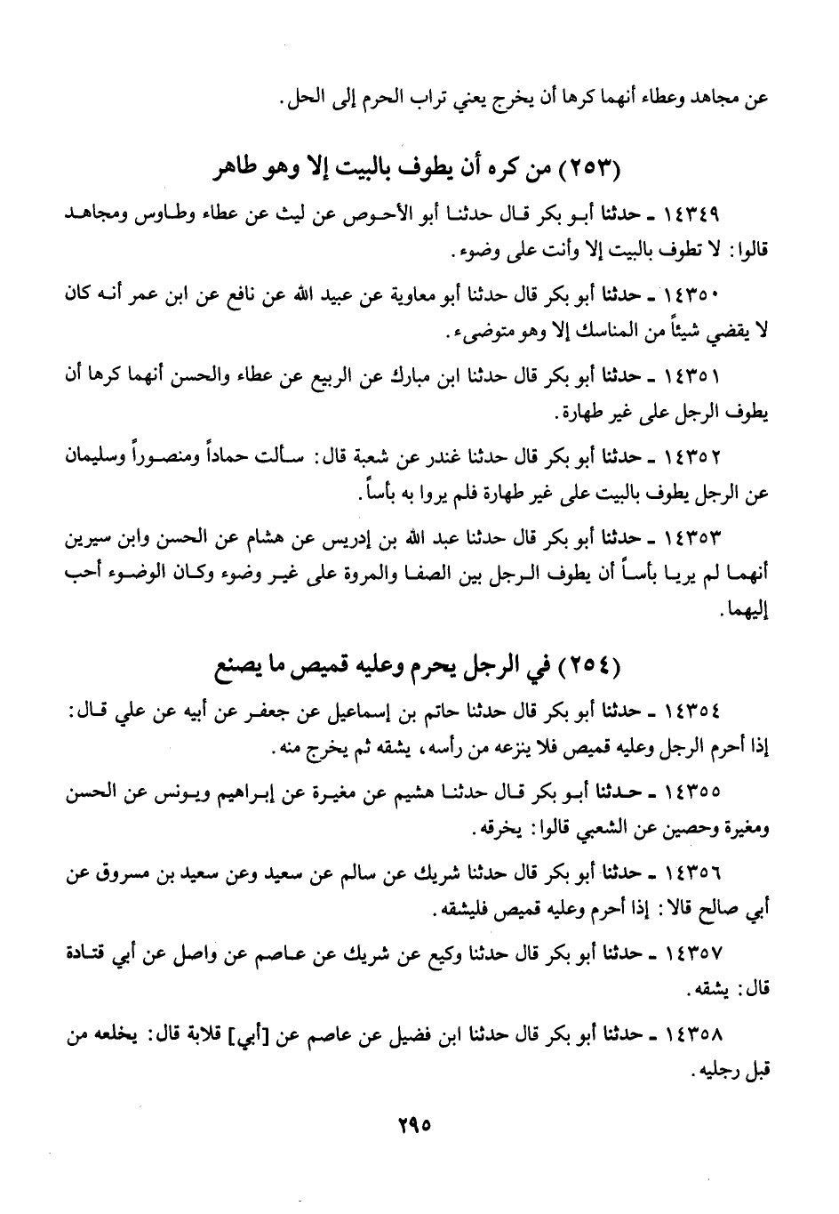 14359 - أَبُو بَكْرٍ قَالَ: حَدَّثَنَا يَحْيَى بْنُ سَعِيدٍ، عَنِ ابْنِ جُرَيْجٍ، عَنِ ابْنِ طَاوُسٍ، عَنْ أَبِيهِ، أَنَّهُ كَانَ يَقُولُ: «§مَنْ أَحْرَمَ وَعَلَيْهِ قَمِيصٌ فَلْيَنْزِعْهُ، وَلَا يَشُقَّهُ»