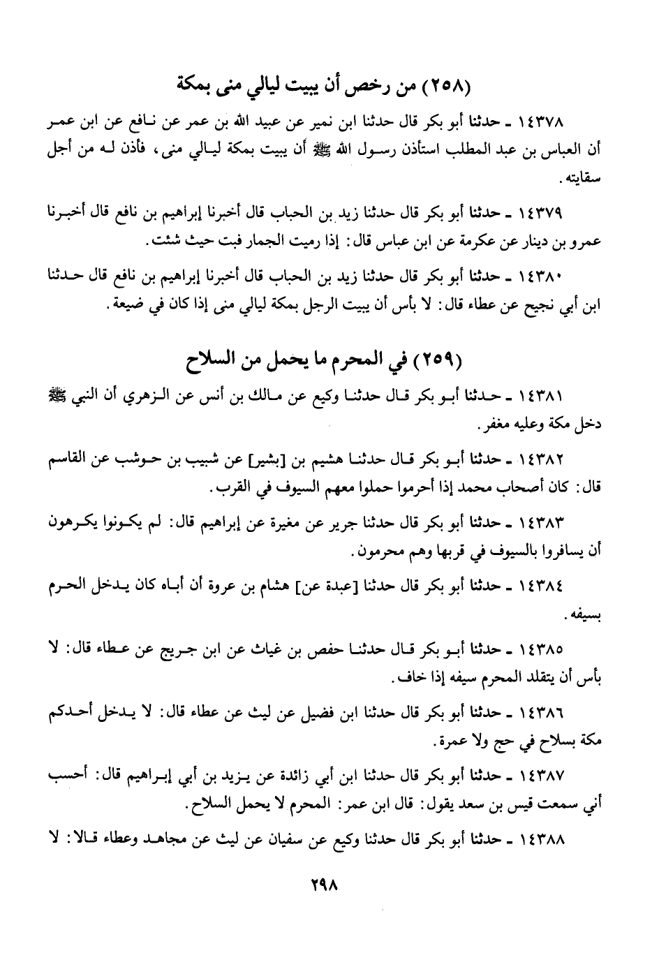 14378 - أَبُو بَكْرٍ قَالَ: حَدَّثَنَا ابْنُ نُمَيْرٍ، عَنْ عُبَيْدِ اللَّهِ بْنِ عُمَرَ، عَنْ نَافِعٍ، عَنِ ابْنِ عُمَرَ، أَنَّ الْعَبَّاسَ بْنَ عَبْدِ الْمُطَّلِبِ §اسْتَأْذَنَ رَسُولَ اللَّهِ صَلَّى اللهُ عَلَيْهِ وَسَلَّمَ أَنْ يَبِيتَ بِمَكَّةَ لَيَالِيَ مِنًى، «فَأَذِنَ لَهُ مِنْ أَجْلِ سِقَايَتِهِ»