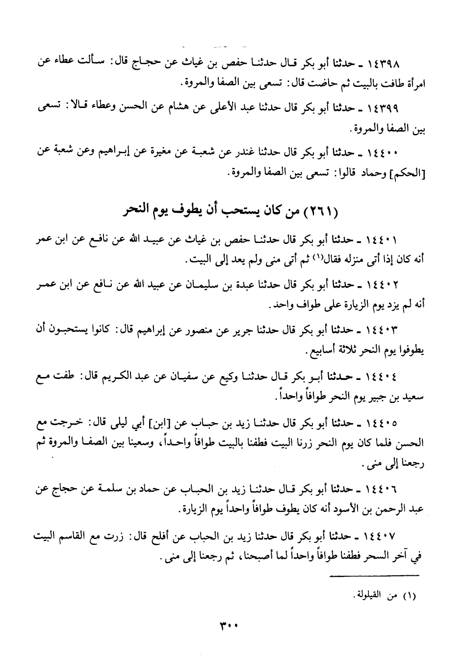 14403 - أَبُو بَكْرٍ قَالَ: حَدَّثَنَا جَرِيرٌ، عَنْ مَنْصُورٍ، عَنْ إِبْرَاهِيمَ قَالَ: «كَانُوا §يَسْتَحِبُّونَ أَنْ يَطُوفُوا، يَوْمَ النَّحْرِ ثَلَاثَةَ أَسَابِيعَ»