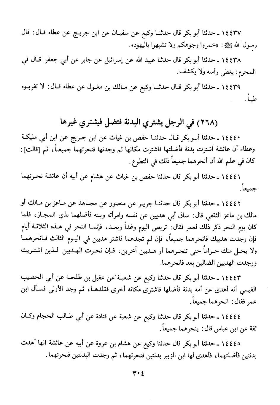 14441 - أَبُو بَكْرٍ قَالَ: حَدَّثَنَا حَفْصُ بْنُ غِيَاثٍ، عَنْ هِشَامٍ، عَنْ أَبِيهِ أَنَّ عَائِشَةَ «نَحَرَتْهُمَا جَمِيعًا»