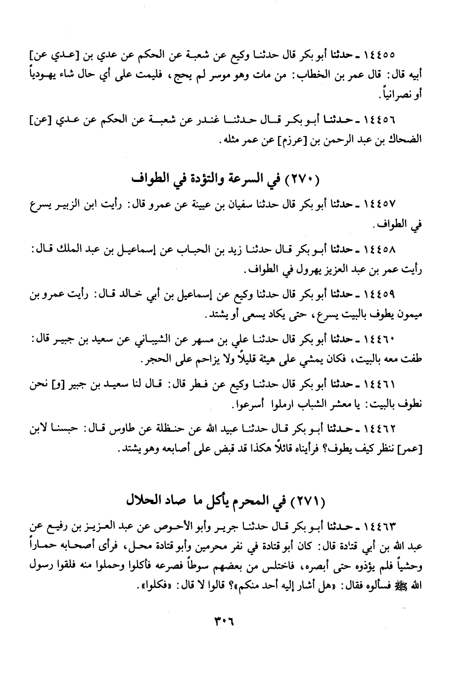 14460 - أَبُو بَكْرٍ قَالَ: حَدَّثَنَا عَلِيُّ بْنُ مُسْهِرٍ، عَنِ الشَّيْبَانِيِّ، عَنْ سَعِيدِ بْنِ جُبَيْرٍ قَالَ: «§طُفْتُ مَعَهُ بِالْبَيْتِ، فَكَانَ يَمْشِي عَلَى هَيْئَةٍ قَلِيلًا، وَلَا يُزَاحِمُ عَلَى الْحَجَرِ»