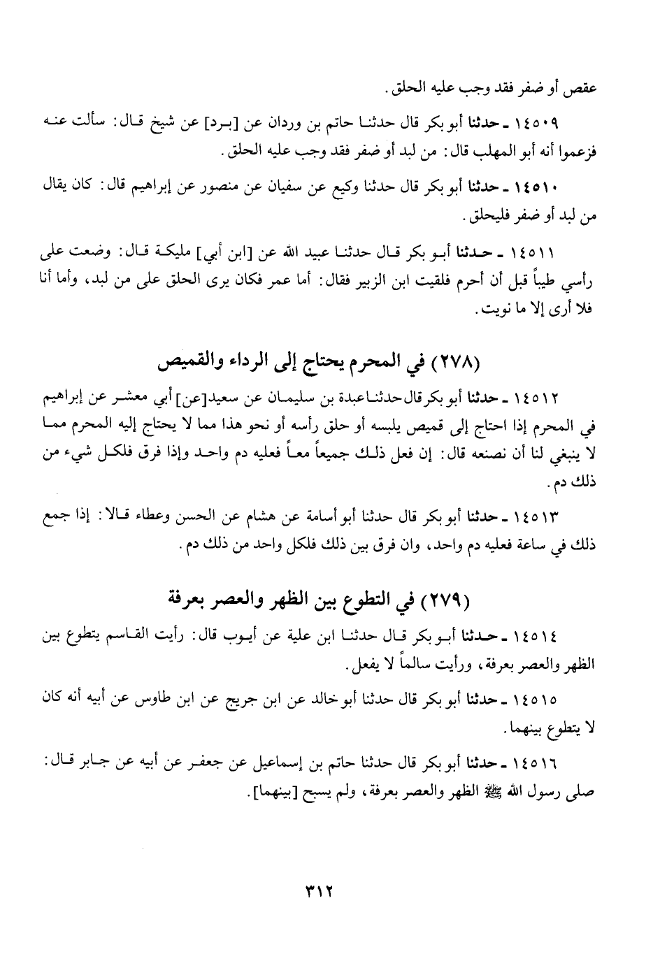 14512 - أَبُو بَكْرٍ قَالَ: حَدَّثَنَا عَبْدَةُ بْنُ سُلَيْمَانَ، عَنْ سَعِيدٍ، عَنْ أَبِي مَعْشَرٍ، عَنْ إِبْرَاهِيمَ، فِي الْمُحْرِمِ إِذَا احْتَاجَ إِلَى قَمِيصٍ يَلْبَسُهُ أَوْ حَلَقَ رَأْسَهُ أَوْ نَحْوِ هَذَا مِمَّا لَا يَحْتَاجُ إِلَيْهِ الْمُحْرِمُ مِمَّا لَا يَنْبَغِي لَنَا أَنْ نَصْنَعَهُ، قَالَ: «§إِنْ فَعَلَ ذَلِكَ جَمِيعًا مَعًا، فَعَلَيْهِ دَمٌ وَاحِدٌ، وَإِذَا فَرَّقَ، فَلِكُلِّ شَيْءٍ مِنْ ذَلِكَ دَمٌ»