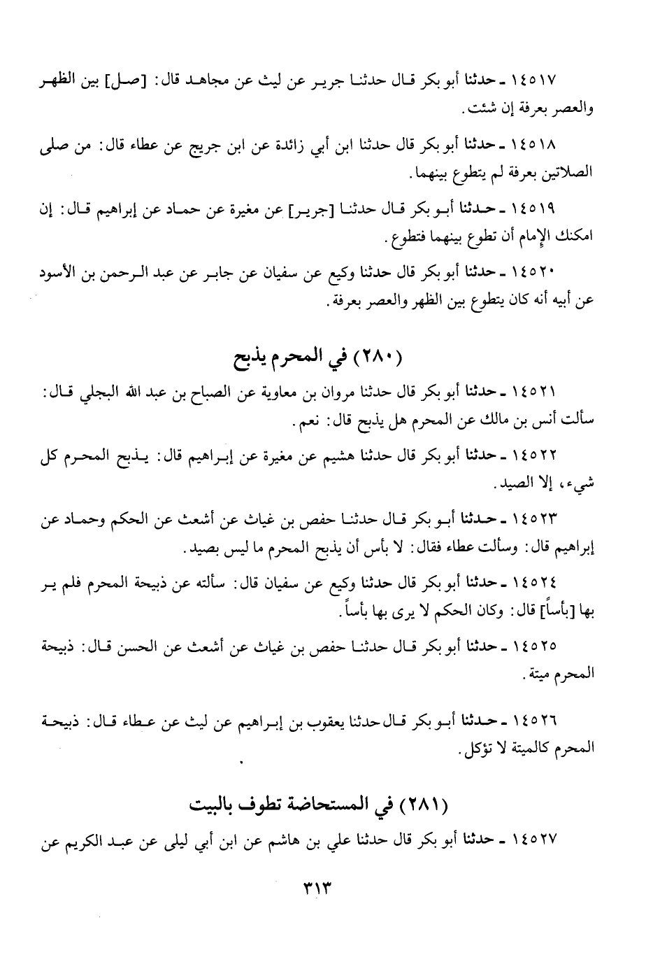 14522 - أَبُو بَكْرٍ قَالَ: حَدَّثَنَا هُشَيْمٌ، عَنْ مُغِيرَةَ، عَنْ إِبْرَاهِيمَ قَالَ: «§يَذْبَحُ الْمُحْرِمُ كُلَّ شَيْءٍ، إِلَّا الصَّيْدَ»