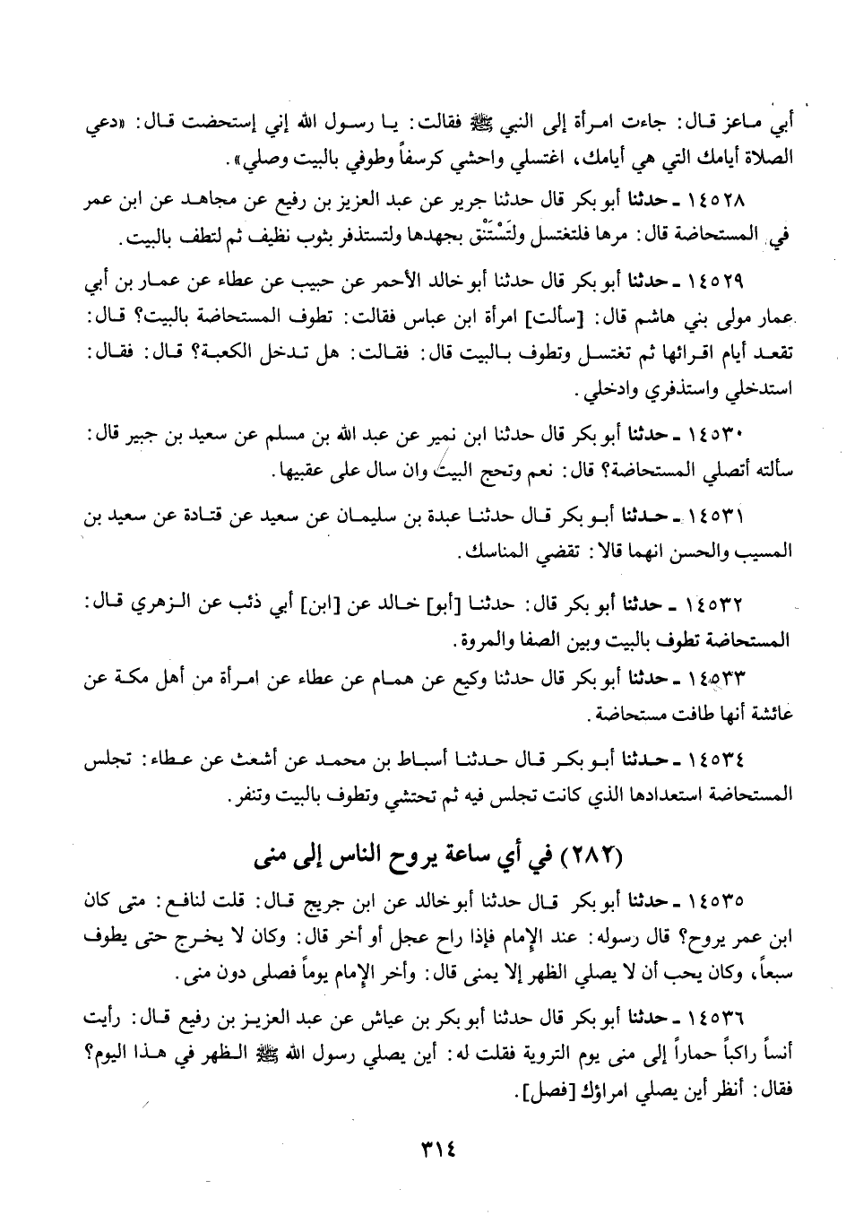 14534 - أَبُو بَكْرٍ قَالَ: حَدَّثَنَا أَسْبَاطُ بْنُ مُحَمَّدٍ، عَنْ أَشْعَثَ، عَنْ عَطَاءٍ، «§تَجْلِسُ الْمُسْتَحَاضَةُ اسْتِعْدَادَهَا الَّذِي كَانَتْ تَجْلِسُ فِيهِ، ثُمَّ تَحْتَشِي، وَتَطُوفُ بِالْبَيْتِ وَتَنْفِرُ»