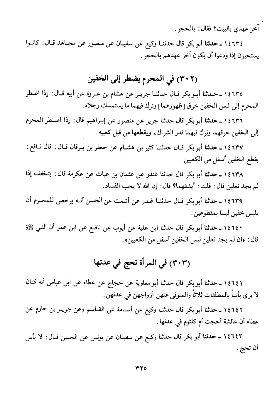 14635 - أَبُو بَكْرٍ قَالَ: حَدَّثَنَا جَرِيرٌ، عَنْ هِشَامِ بْنِ عُرْوَةَ، عَنْ أَبِيهِ، قَالَ: «§إِذَا اضْطُرَّ الْمُحْرِمُ إِلَى لُبْسِ الْخُفَّيْنِ، خَرَقَ ظُهُورَهُمَا، وَتَرَكَ فِيهِمَا مَا يَسْتَمْسِكُ رِجْلَاهُ»