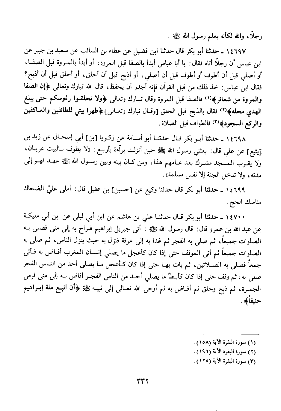 14700 - أَبُو بَكْرٍ قَالَ: حَدَّثَنَا عَلِيُّ بْنُ هَاشِمٍ، عَنِ ابْنِ أَبِي لَيْلَى، عَنِ ابْنِ أَبِي مُلَيْكَةَ، عَنْ عَبْدِ اللَّهِ بْنِ عَمْرٍو قَالَ: قَالَ رَسُولُ اللَّهِ صَلَّى اللهُ عَلَيْهِ وَسَلَّمَ: «§أَتَى جِبْرِيلُ إِبْرَاهِيمَ فَرَاحَ بِهِ إِلَى مِنًى، فَصَلَّى بِهِ الصَّلَوَاتِ جَمِيعًا، ثُمَّ صَلَّى بِهِ الْفَجْرَ، ثُمَّ غَدَا بِهِ إِلَى عَرَفَةَ، فَنَزَلَ بِهِ حَيْثُ يَنْزِلُ النَّاسُ، ثُمَّ صَلَّى بِهِ الصَّلَوَاتِ جَمِيعًا، ثُمَّ أَتَى الْمَوْقِفَ، حَتَّى إِذَا كَانَ كَأَعْجَلِ مَا يُصَلِّي إِنْسَانٌ الْمَغْرِبَ، أَفَاضَ بِهِ، فَأَتَى جَمْعًا، فَصَلَّى بِهِ الصَّلَاتَيْنِ، ثُمَّ بَاتَ بِهَا حَتَّى إِذَا كَانَ كَأَعْجَلِ مَا يُصَلِّي أَحَدٌ مِنَ النَّاسِ الْفَجْرَ صَلَّى بِهِ، ثُمَّ وَقَفَ، حَتَّى إِذَا كَانَ كَأَبْطَأِ مَا يُصَلِّي أَحَدٌ مِنَ النَّاسِ الْفَجْرَ، أَفَاضَ بِهِ إِلَى مِنًى فَرَمَى الْجَمْرَةَ، ثُمَّ ذَبَحَ وَحَلَقَ، ثُمَّ أَفَاضَ بِهِ»، ثُمَّ أَوْحَى اللَّهُ تَعَالَى إِلَى نَبِيِّهِ صَلَّى اللهُ عَلَيْهِ وَسَلَّمَ: {أَنِ اتَّبِعْ مِلَّةَ إِبْرَاهِيمَ حَنِيفًا} [النحل: 123] "