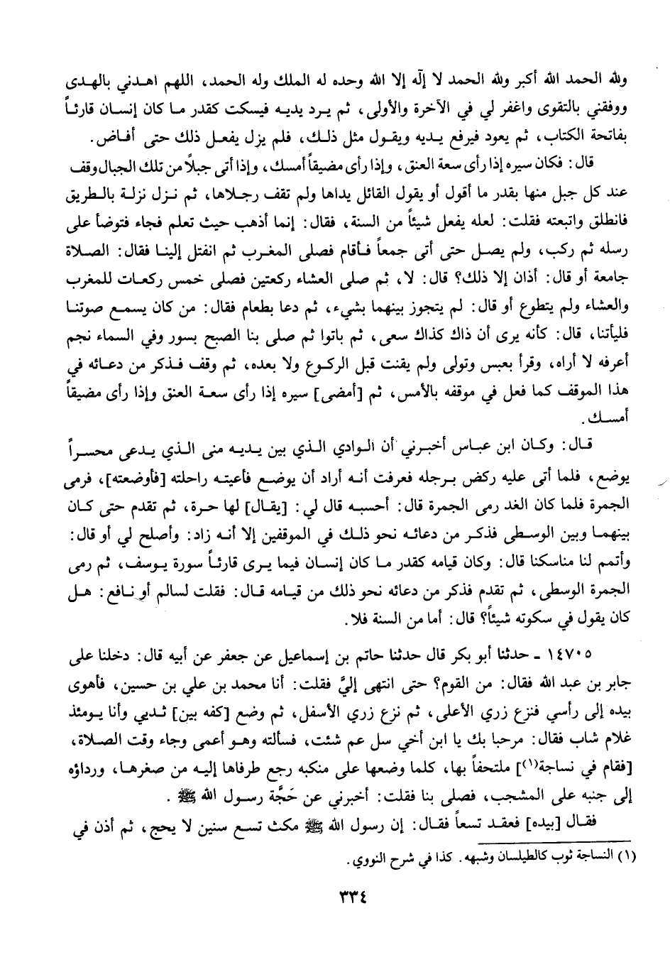 14705 - أَبُو بَكْرٍ قَالَ: حَدَّثَنَا حَاتِمُ بْنُ إِسْمَاعِيلَ، عَنْ جَعْفَرٍ، عَنْ أَبِيهِ قَالَ: دَخَلْنَا عَلَى جَابِرِ بْنِ عَبْدِ اللَّهِ فَقَالَ: مَنَ الْقَوْمُ؟ حَتَّى انْتَهَى إِلَيَّ، فَقُلْتُ: أَنَا مُحَمَّدُ بْنُ عَلِيِّ بْنِ حُسَيْنٍ، فَأَهْوَى بِيَدِهِ إِلَى رَأْسِي، فَنَزَعَ زِرِّي الْأَعْلَى، ثُمَّ نَزَعَ زِرِّي الْأَسْفَلَ، ثُمَّ وَضَعَ كَفَّهُ بَيْنَ ثَدْيَيِّ، وَأَنَا يَوْمئِذٍ غُلَامٌ شَابٌّ، فَقَالَ: مَرْحَبًا بِكَ يَا ابْنَ أَخِي سَلْ عَمَّا شِئْتَ، فَسَأَلْتُهُ وَهُوَ أَعْمَى، وَجَاءَ وَقْتُ الصَّلَاةِ، فَقَامَ فِي نِسَاجَةٍ مُلْتَحِفًا بِهَا، كُلَّمَا وَضَعَهَا عَلَى مَنْكِبِهِ رَجَعَ طَرَفَاهَا إِلَيْهِ مِنْ صِغَرِهَا، وَرِدَاؤُهُ إِلَى جَنْبِهِ عَلَى الْمِشْجَبِ، فَصَلَّى بِنَا، فَقُلْتُ: أَخْبِرْنِي عَنْ حَجَّةِ رَسُولِ اللَّهِ صَلَّى اللهُ عَلَيْهِ وَسَلَّمَ، فَقَالَ بِيَدِهِ فَعَقَدَ تِسْعًا فَقَالَ: إِنَّ رَسُولَ اللَّهِ صَلَّى اللهُ عَلَيْهِ وَسَلَّمَ مَكَثَ تِسْعَ سِنِينَ لَا يَحُجُّ، ثُمَّ أَذَّنَ فِي -[335]- النَّاسِ بِالْحَجِّ فِي الْعَاشِرَةِ: أَنَّ رَسُولَ اللَّهِ صَلَّى اللهُ عَلَيْهِ وَسَلَّمَ حَاجٌّ، فَقَدِمَ الْمَدِينَةَ بَشَرٌ كَثِيرٌ كُلُّهُمْ يَلْتَمِسُ أَنْ يَأْتَمَّ بِرَسُولِ اللَّهِ صَلَّى اللهُ عَلَيْهِ وَسَلَّمَ، وَيَعْمَلَ مِثْلَ عَمَلِهِ، فَخَرَجْنَا مَعَهُ حَتَّى أَتَيْنَا ذَا الْحُلَيْفَةَ، فَوَلَدَتْ أَسْمَاءُ بِنْتُ عُمَيْسٍ مُحَمَّدَ بْنَ أَبِي بَكْرٍ، فَأَرْسَلَتْ إِلَى رَسُولِ اللَّهِ صَلَّى اللهُ عَلَيْهِ وَسَلَّمَ كَيْفَ أَصْنَعُ؟ قَالَ: «§اغْتَسِلِي وَاسْتَذْفِرِي بِثَوْبٍ، وَأَحْرِمِي»، فَصَلَّى رَسُولُ اللَّهِ صَلَّى اللهُ عَلَيْهِ وَسَلَّمَ فِي الْمَسْجِدِ، ثُمَّ رَكِبَ الْقَصْوَاءَ حَتَّى إِذَا اسْتَوَتْ بِهِ نَاقَتُهُ عَلَى الْبَيْدَاءِ، نَظَرْتُ إِلَى مَدَى بَصَرِي مِنْ بَيْنِ يَدَيْهِ مِنْ رَاكِبٍ وَمَاشٍ، وَعَنْ يَمِينِهِ مِثْلُ ذَلِكَ وَعَنْ يَسَارِهِ مِثْلُ ذَلِكَ، وَمِنْ خَلْفِهِ مِثْلُ ذَلِكَ، وَرَسُولُ اللَّهِ صَلَّى اللهُ عَلَيْهِ وَسَلَّمَ بَيْنَ أَظْهُرِنَا وَعَلَيْهِ يَنْزِلُ الْقُرْآنُ وَهُوَ يَعْرِفُ تَأْوِيلَهُ، وَمَا عَمِلَ بِهِ مِنْ شَيْءٍ عَمِلْنَا بِهِ، فَأَهَلَّ بِالتَّوْحِيدِ، «لَبَّيْكَ اللَّهُمَّ لَبَّيْكَ، لَبَّيْكَ لَا شَرِيكَ لَكَ لَبَّيْكَ، إِنَّ الْحَمْدَ وَالنِّعْمَةَ لَكَ وَالْمُلْكَ، لَا شَرِيكَ لَكَ» وَأَهَلَّ النَّاسُ بِهَذَا الَّذِي يُهِلُّونَ بِهِ، فَلَمْ يَرُدَّ عَلَيْهِمْ رَسُولُ اللَّهِ صَلَّى اللهُ عَلَيْهِ وَسَلَّمَ شَيْئًا مِنْهُ وَلَزِمَ رَسُولُ اللَّهِ صَلَّى اللهُ عَلَيْهِ وَسَلَّمَ تَلْبِيَتَهُ وَقَالَ جَابِرٌ: لَسْنَا نَنْوِي إِلَّا الْحَجَّ، لَسْنَا نَعْرِفُ الْعُمْرَةَ حَتَّى إِذَا أَتَيْنَا الْبَيْتَ مَعَهُ اسْتَلَمَ الرُّكْنَ، فَرَمَلَ ثَلَاثًا وَمَشَى أَرْبَعًا، ثُمَّ تَقَدَّمَ إِلَى مَقَامِ إِبْرَاهِيمَ فَقَرَأَ: {وَاتَّخِذُوا مِنْ مَقَامِ إِبْرَاهِيمَ مُصَلًّى} [البقرة: 125]، فَجَعَلَ الْمَقَامَ بَيْنَهُ وَبَيْنَ الْبَيْتِ، فَكَانَ أَبِي يَقُولُ: وَلَا أَعْلَمُهُ ذَكَرَهُ إِلَّا، عَنِ النَّبِيِّ صَلَّى اللهُ عَلَيْهِ وَسَلَّمَ كَانَ يَقْرَأُ فِي الرَّكْعَتَيْنِ: قُلْ هُوَ اللَّهُ أَحَدٌ، وَقُلْ يَا أَيُّهَا الْكَافِرُونَ ثُمَّ رَجَعَ إِلَى الرُّكْنِ، فَاسْتَلَمَهُ ثُمَّ خَرَجَ مِنَ الْبَابِ إِلَى الصَّفَا، فَلَمَّا دَنَا مِنَ الصَّفَا قَرَأَ: {إِنَّ الصَّفَا وَالْمَرْوَةَ مِنْ شَعَائِرِ} [البقرة: 158] اللَّهِ، أَبْدَأُ بِمَا بَدَأَ اللَّهُ بِهِ، فَبَدَأَ بِالصَّفَا فَرَقَى عَلَيْهِ حَتَّى رَأَى الْبَيْتَ، فَاسْتَقْبَلَ الْبَيْتَ وَوَحَّد