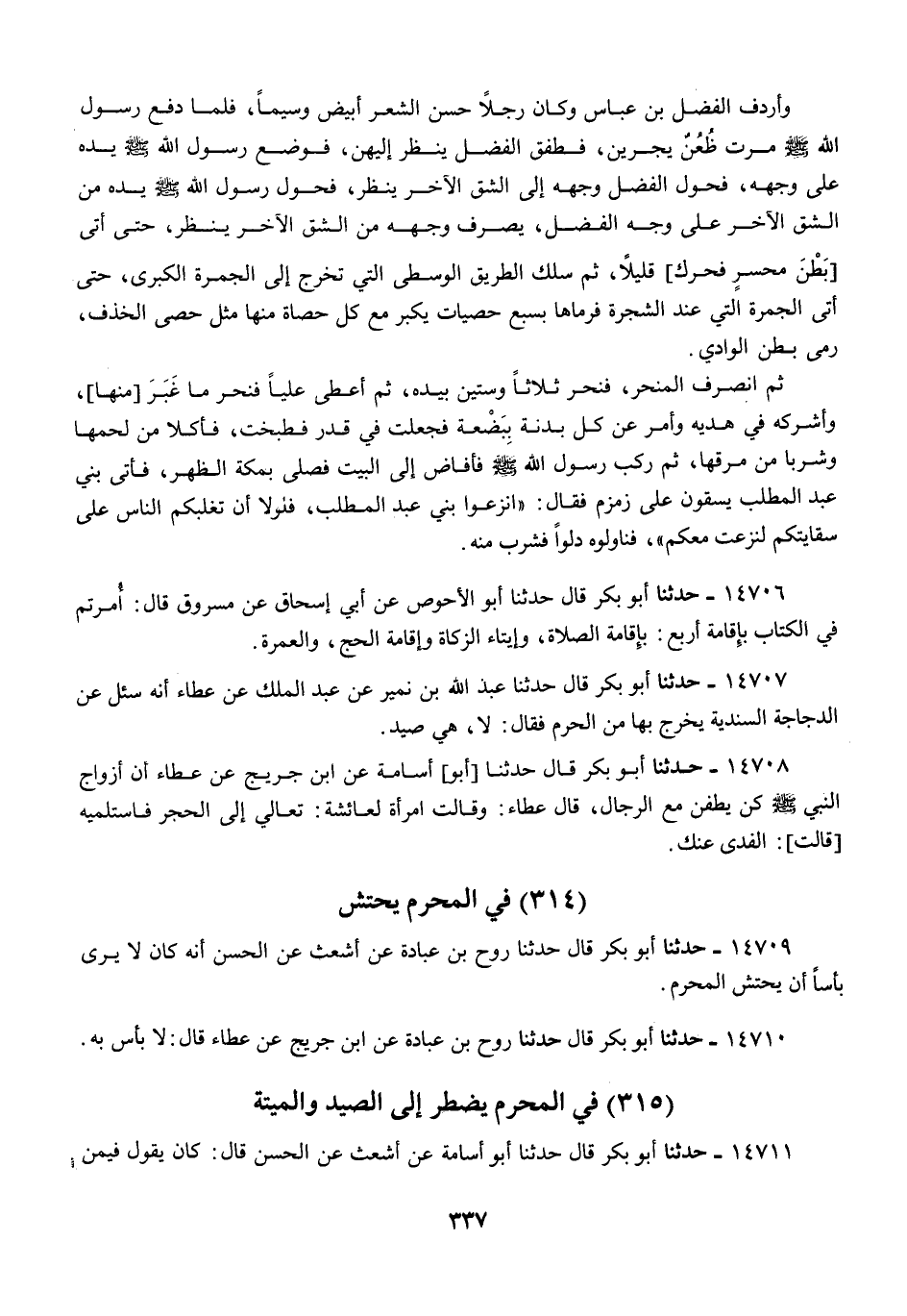 14709 - أَبُو بَكْرٍ قَالَ: حَدَّثَنَا رَوْحُ بنُ عُبَادَةَ، عَنْ أَشْعَثَ، عَنِ الْحَسَنِ، أَنَّهُ كَانَ §لَا يَرَى بَأْسًا أَنْ يَحْتَشَّ الْمُحْرِمُ " حَدَّثَنَا