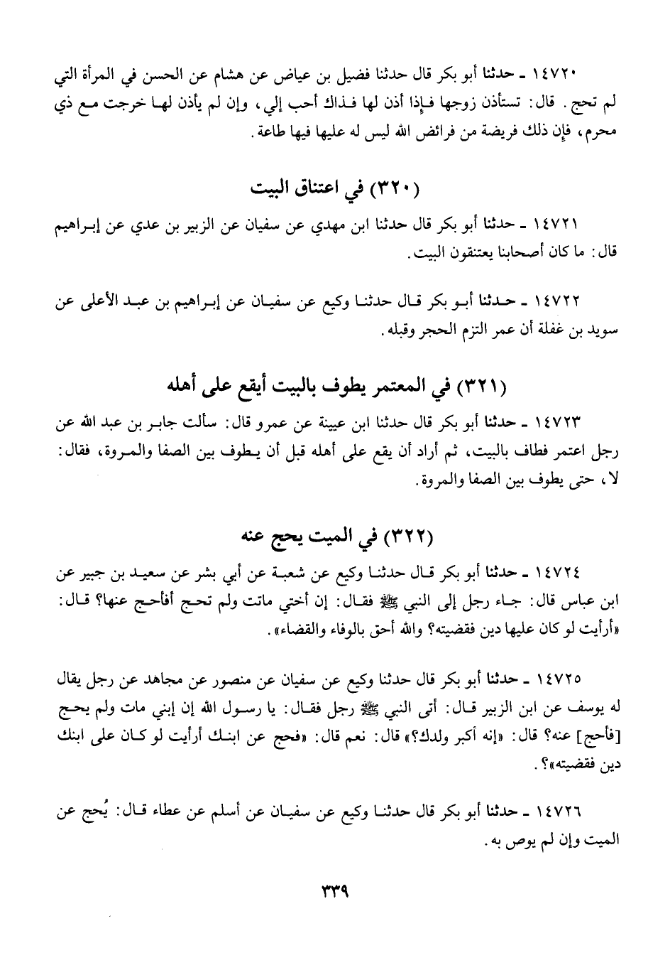 14721 - أَبُو بَكْرٍ قَالَ: حَدَّثَنَا ابْنُ مَهْدِيٍّ، عَنْ سُفْيَانَ، عَنِ الزُّبَيْرِ بنِ عَدِيٍّ، عَنْ إِبْرَاهِيمَ قَالَ: «§مَا كَانَ أَصْحَابُنَا يَعْتَنِقُونَ الْبَيْتَ»