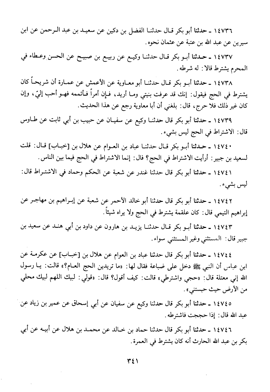 14740 - أَبُو بَكْرٍ قَالَ: حَدَّثَنَا عَبَّادُ بْنُ الْعَوَّامِ، عَنْ هِلَالِ بْنِ خَبَّابٍ، قَالَ: قُلْتُ لِسَعِيدِ بْنِ جُبَيْرٍ: أَرَأَيْتَ الِاشْتِرَاطَ فِي الْحَجِّ؟ قَالَ: «إِنَّمَا §الِاشْتِرَاطُ فِي الْحَجِّ فِيمَا بَيْنَ النَّاسِ»
