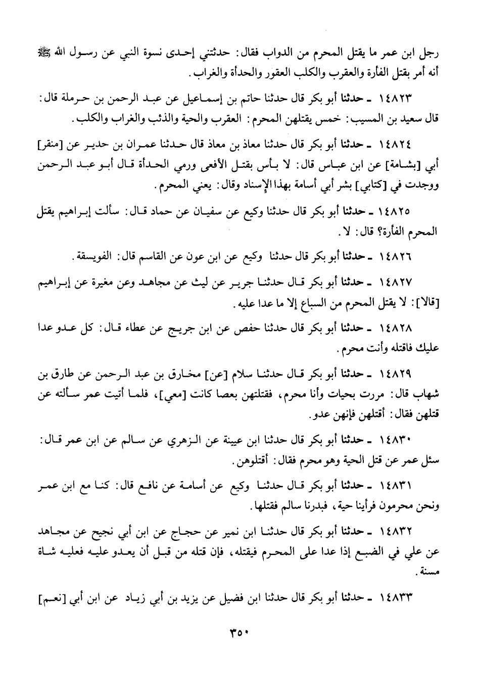 14829 - أَبُو بَكْرٍ قَالَ: حَدَّثَنَا سَلَّامٌ، عَنْ مُخَارِقِ بْنِ عَبْدِ الرَّحْمَنِ، عَنْ طَارِقِ بْنِ شِهَابٍ قَالَ: مَرَرْتُ بِحَيَّاتٍ وَأَنَا مُحْرِمٌ، فَقَتَلْتُهُنَّ بِعَصًا كَانَتْ مَعِي، فَلَمَّا أَتَيْتُ عُمَرَ سَأَلْتُهُ عَنْ قَتْلِهِنَّ فَقَالَ: «§اقْتُلْهُنَّ فَإِنَّهُنَّ عَدُوٌّ»