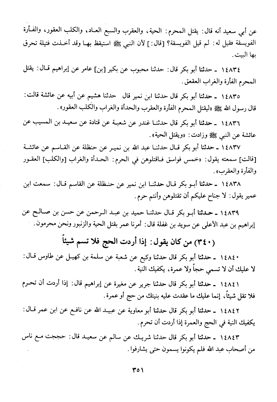 14838 - أَبُو بَكْرٍ قَالَ: حَدَّثَنَا ابْنُ نُمَيْرٍ، عَنْ حَنْظَلَةَ، عَنِ الْقَاسِمِ، قَالَ: سَمِعْتُ ابْنَ عُمَيْرٍ يَقُولُ: «§لَا جُنَاحَ عَلَيْكُمْ أَنْ تَقْتُلُوهُنَّ، وَأَنْتُمْ حُرُمٌ»