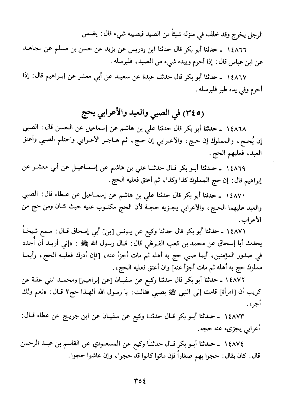 14868 - أَبُو بَكْرٍ قَالَ: حَدَّثَنَا عَلِيُّ بْنُ هَاشِمٍ، عَنْ إِسْمَاعِيلَ، عَنِ الْحَسَنِ قَالَ: «§الصَّبِيُّ إِنْ حَجَّ، وَالْمَمْلُوكُ إِنْ حَجَّ، وَالْأَعْرَابِيُّ إِنْ حَجَّ، ثُمَّ هَاجَرَ الْأَعْرَابِيُّ، وَاحْتَلَمَ الصَّبِيُّ، وَأُعْتِقَ الْعَبْدُ، فَعَلَيْهِمُ الْحَجُّ»