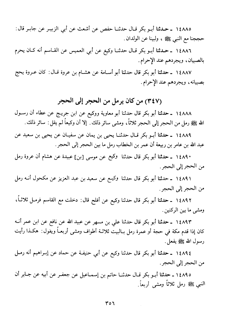 14891 - أَبُو بَكْرٍ قَالَ: حَدَّثَنَا وَكِيعٌ، عَنْ سَعِيدِ بْنِ عَبْدِ الْعَزِيزِ، عَنْ مَكْحُولٍ، «أَنَّهُ §رَمَلَ مِنَ الْحَجَرِ إِلَى الْحَجَرِ»
