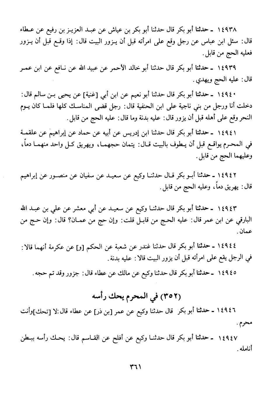 14946 - أَبُو بَكْرٍ قَالَ: حَدَّثَنَا وَكِيعٌ، عَنْ عُمَرَ بْنِ ذَرٍّ، عَنْ عَطَاءٍ قَالَ: «§لَا تَحُكَّ وَأَنْتَ مُحْرِمٌ»